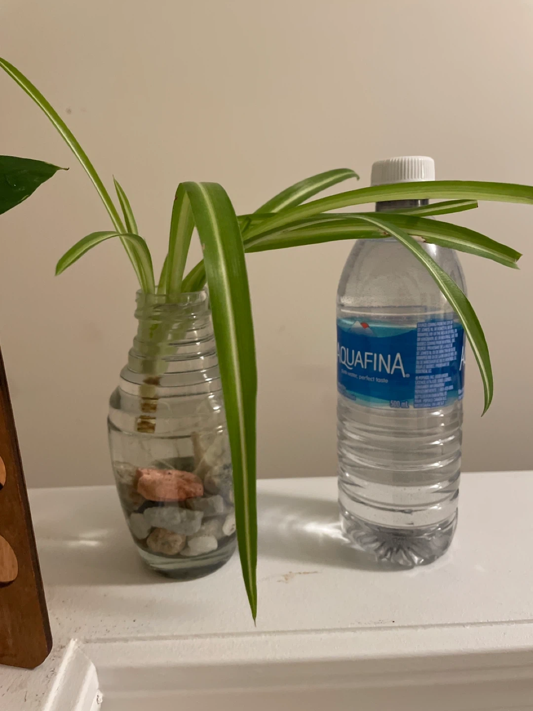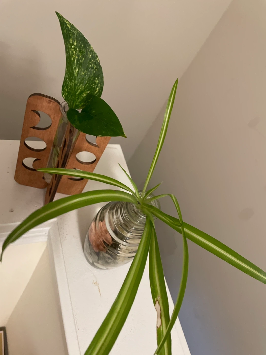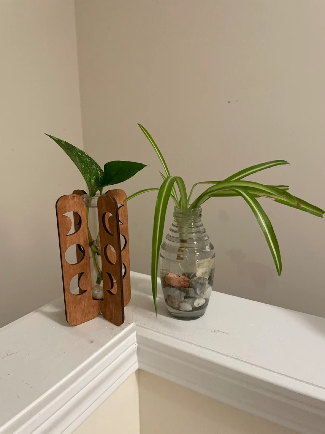 1000+Selling a potted pothos and spider plant in a cute glass vase with decorative rocks. The plant is healthy and ready to brighten up your space!