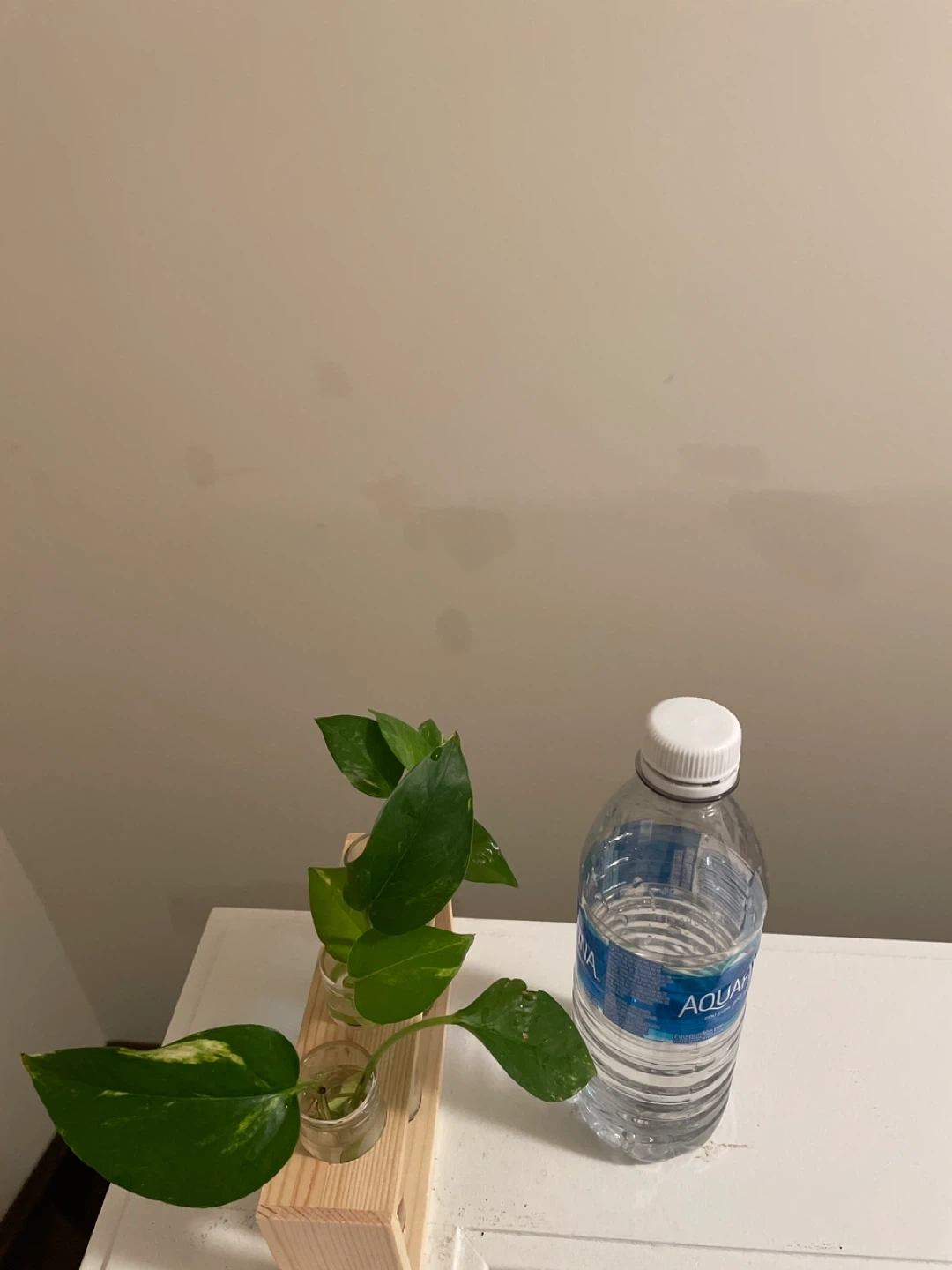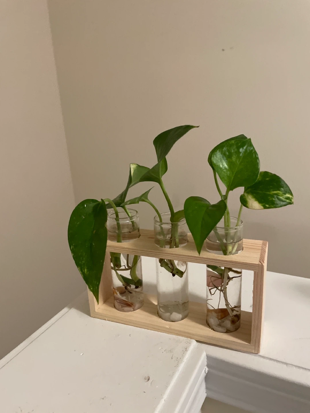 1000+Cute little pothos propagation station! It has three glass tubes in a wooden stand, perfect for starting new plants or displaying cuttings