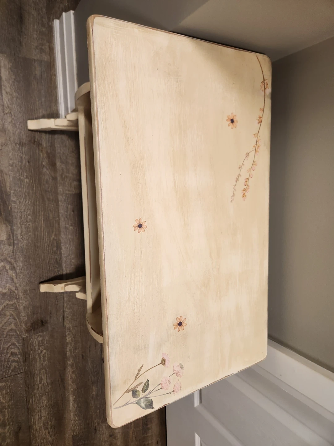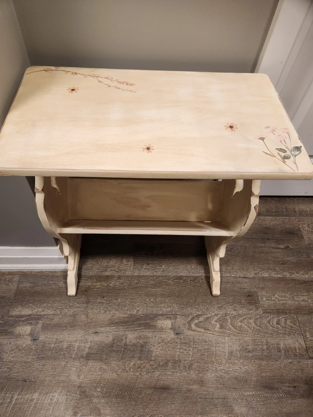 Selling a charming cream-painted accent table. It features a unique design with floral accents on the top surface. Perfect for adding a touch of vintage style to any room!