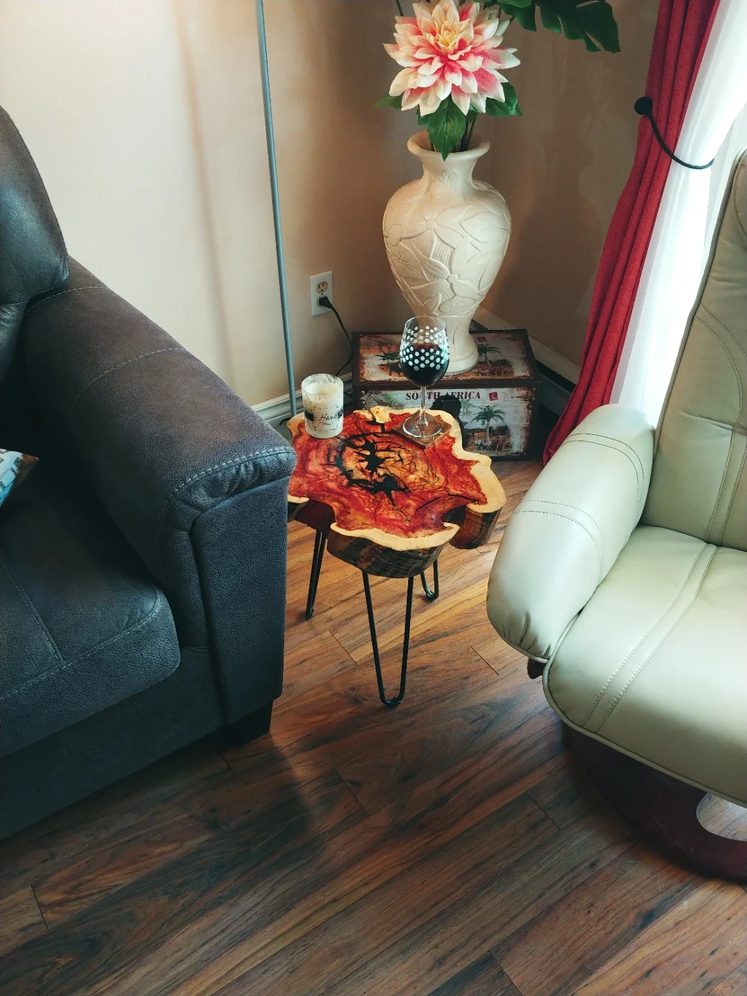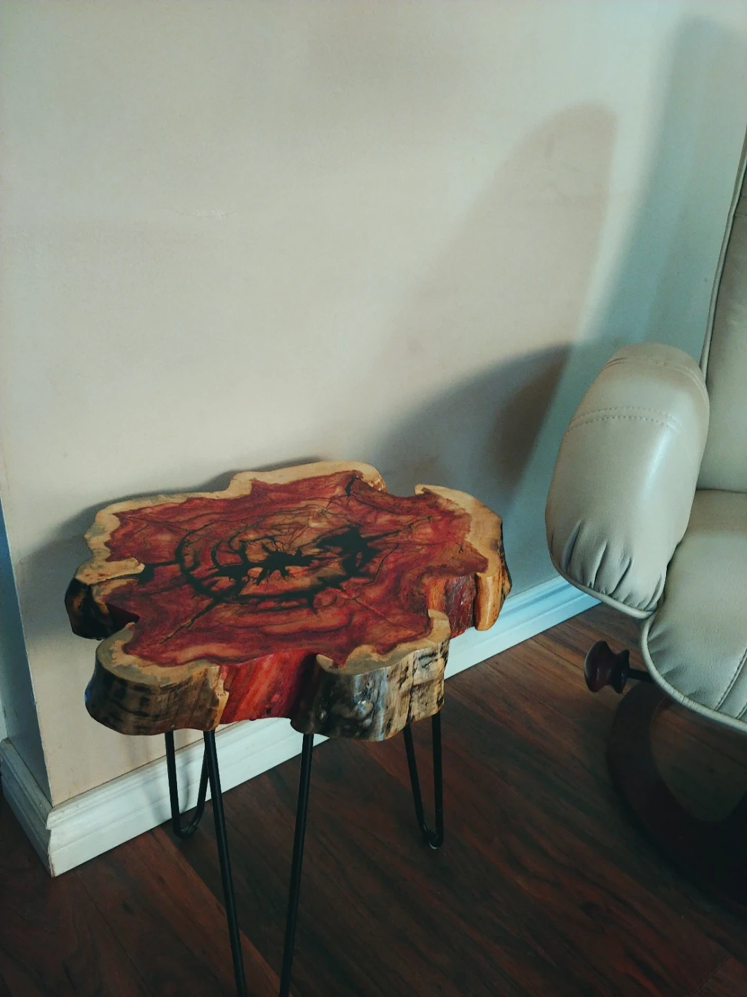 A unique live edge wood slice side table with a red-stained top and natural wood grain. It's supported by sleek black hairpin legs. This table adds a rustic yet modern touch to any space. Great as a plant stand or accent table!