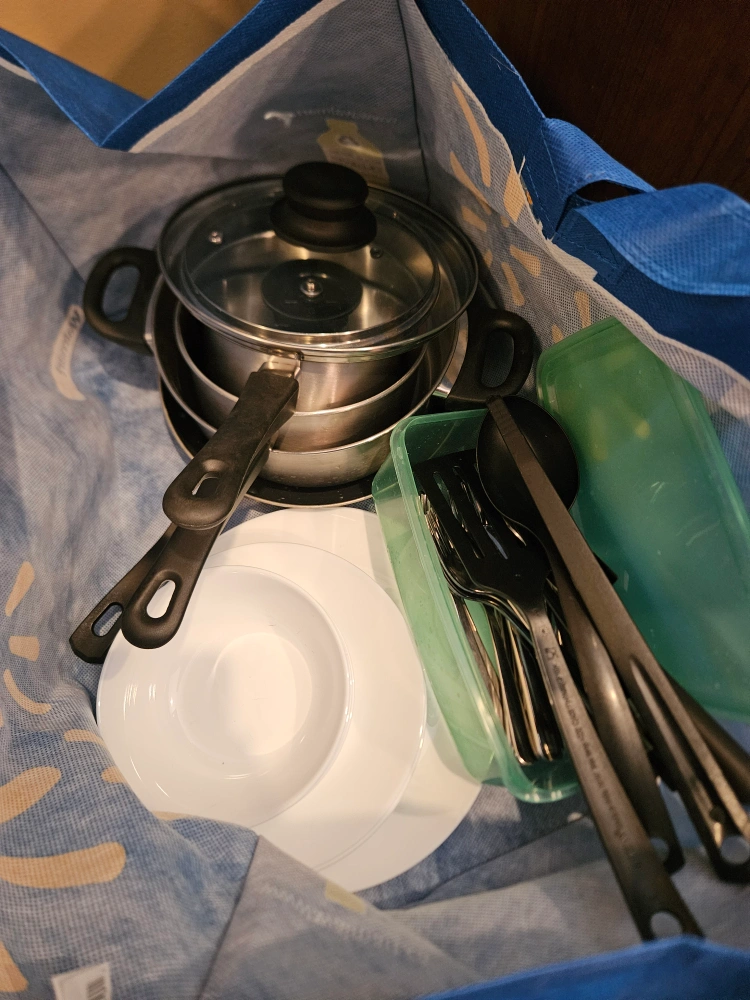 47Selling a set of pots, bowls, and cutlery. Perfect for a starter kitchen or for someone looking to add to their collection! The set includes various sizes of pots with a lid, white bowls, and black cutlery in a green container