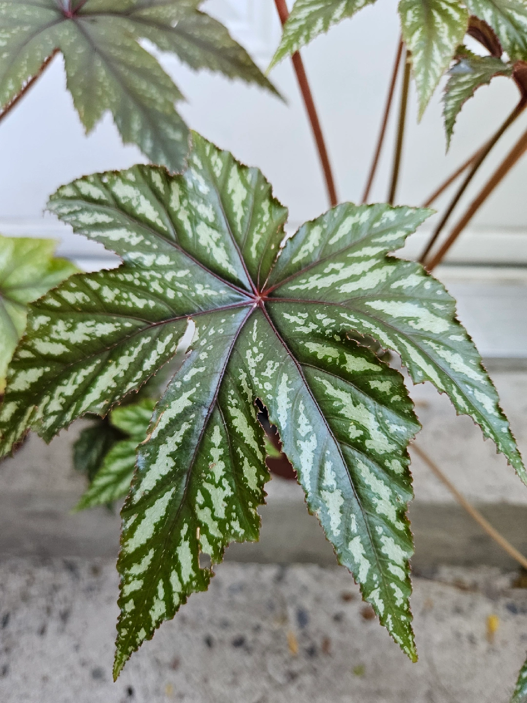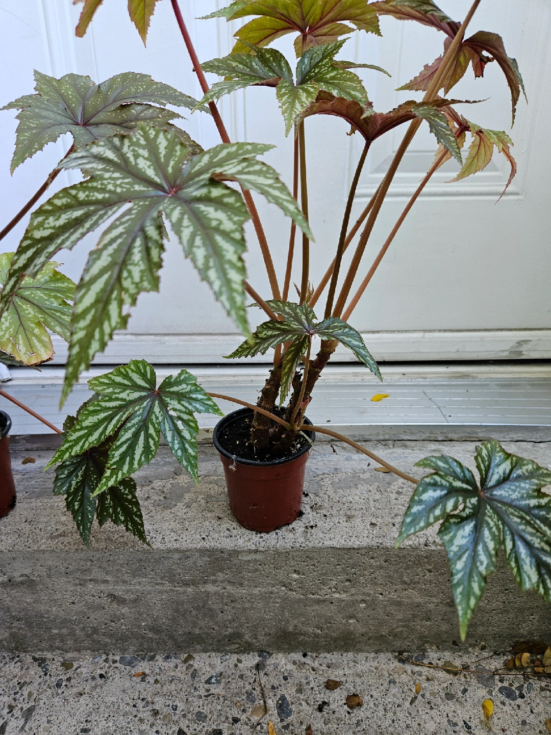 Selling a lovely potted begonia plant! It has unique star-shaped leaves with a beautiful pattern. Perfect for adding some greenery to your home or garden