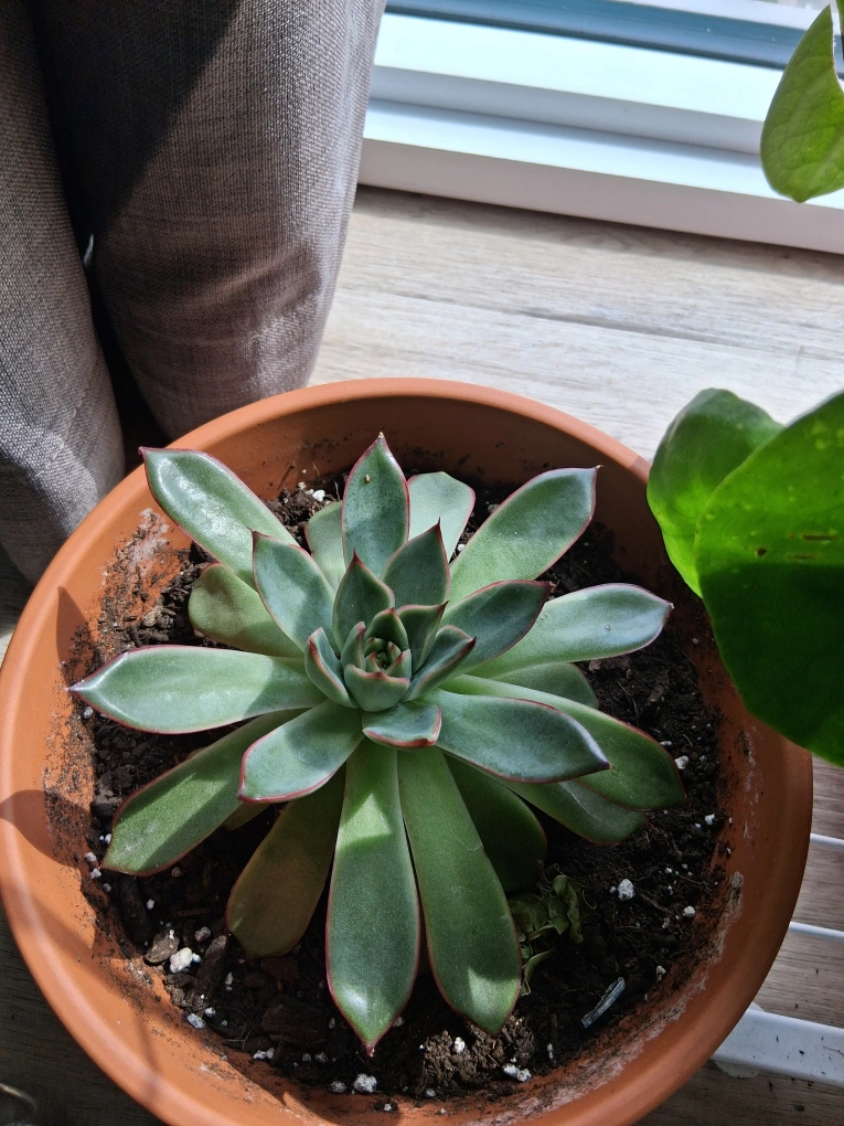 Selling a healthy Echeveria succulent in a terracotta pot. It's a beautiful addition to any indoor space and easy to care for. The plant has vibrant green leaves with reddish edges. Perfect for adding a touch of nature to your home!