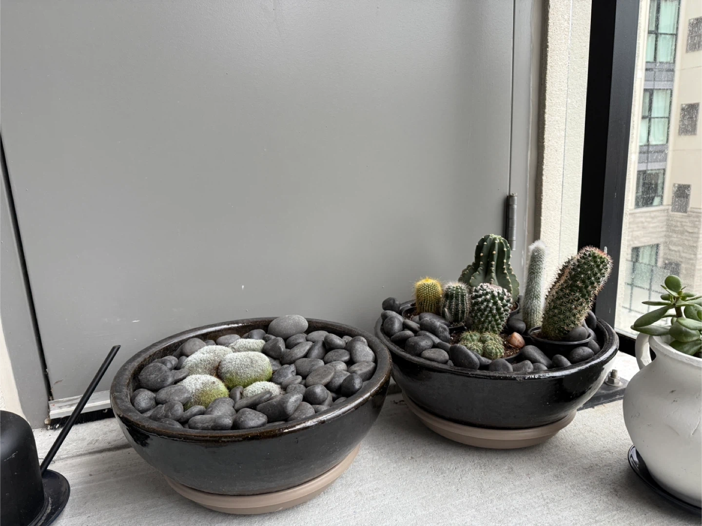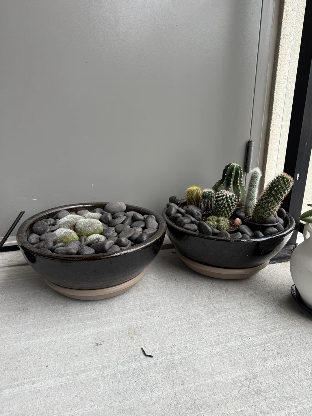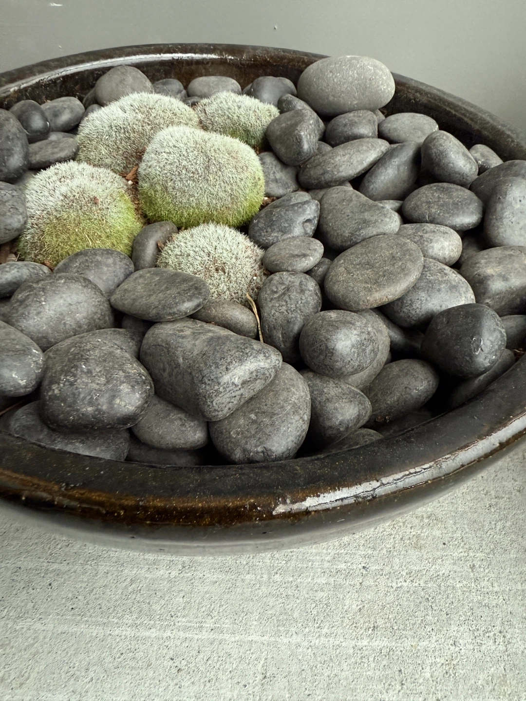 I'm selling a potted succulent arrangement featuring black river rocks. It's a beautiful decorative piece that would look great in any home or office. The arrangement includes a variety of succulents and moss-like plants, all carefully placed among the smooth, dark stones. It's a low-maintenance way to bring a touch of nature indoors - the pots are ceramic and gotten from pottery barn Both for $50