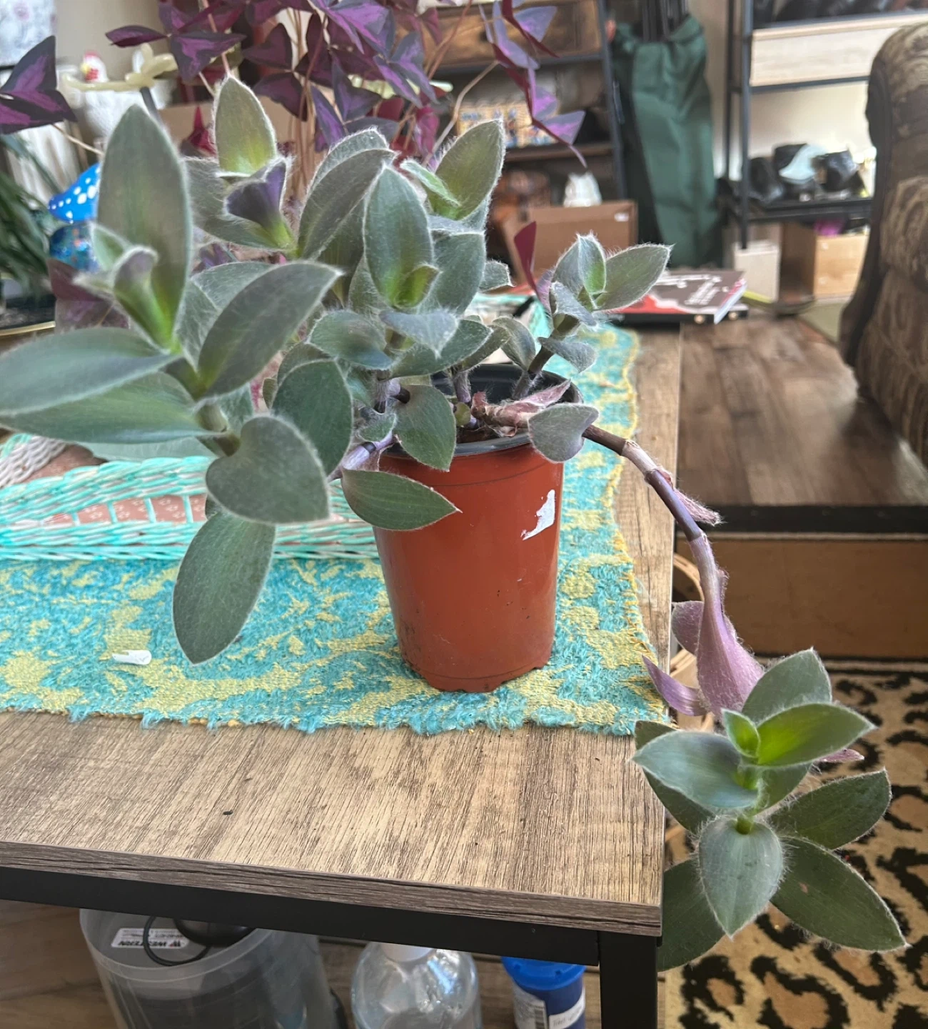 Here's a lovely Tradescantia plant, ready to brighten up your space! It's currently potted and looking for a new home. The leaves have a unique fuzzy texture that adds a touch of charm.