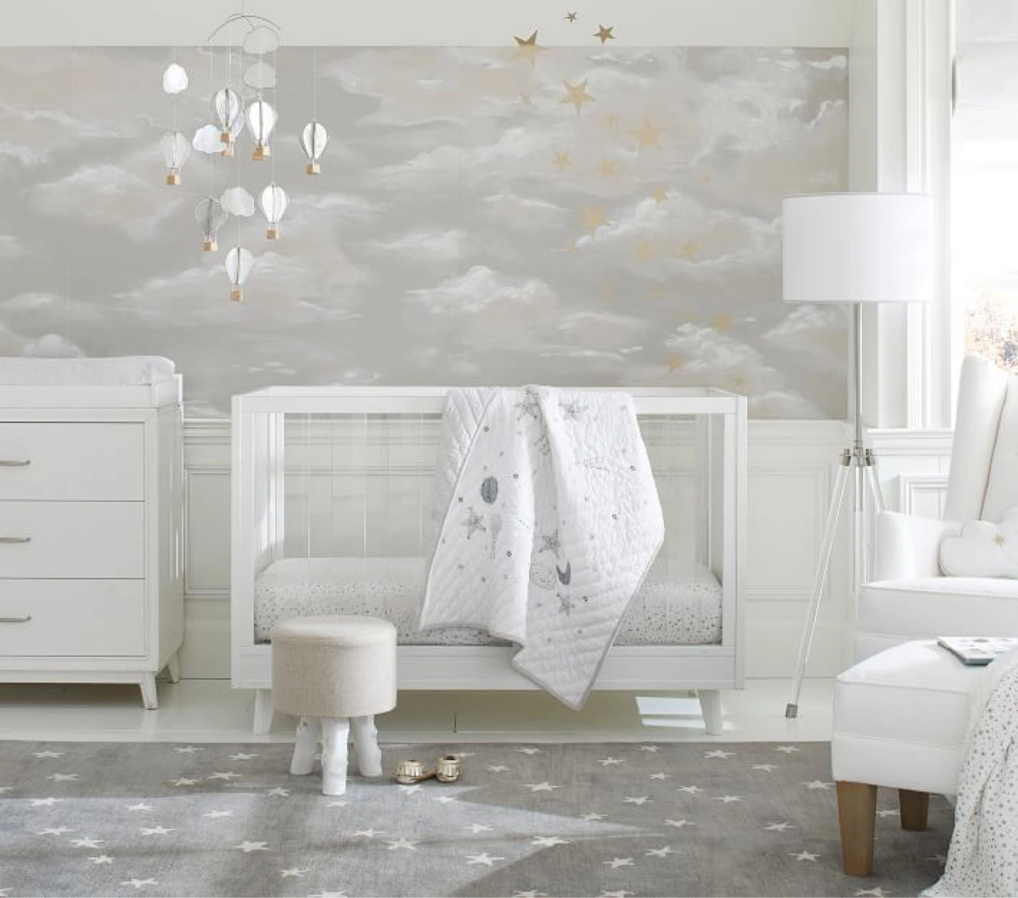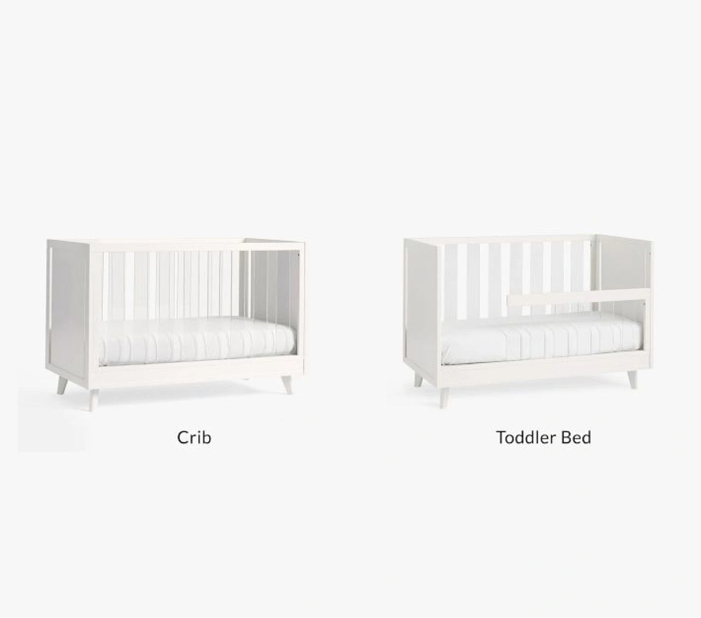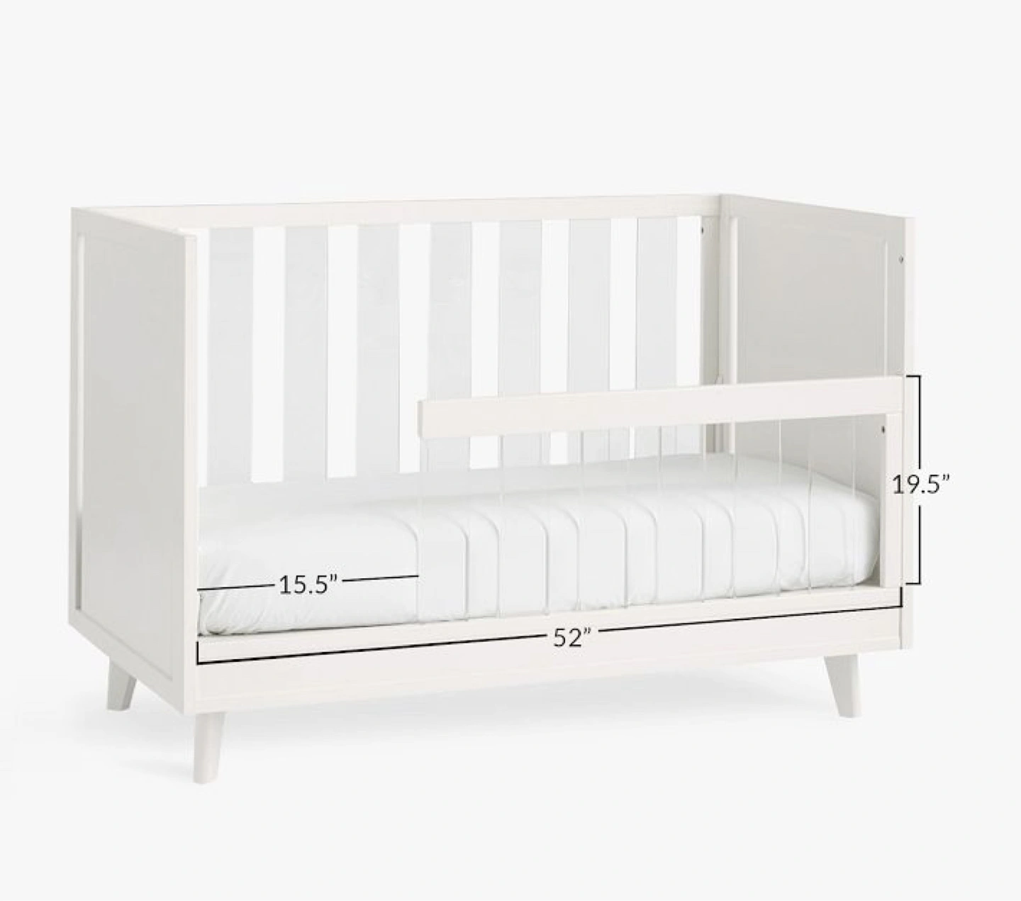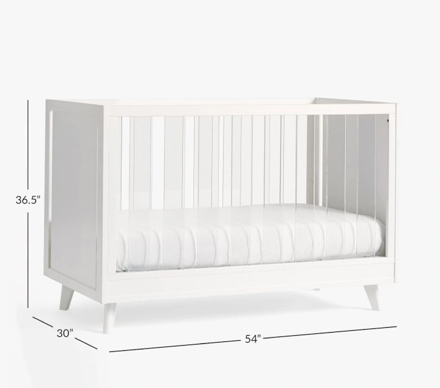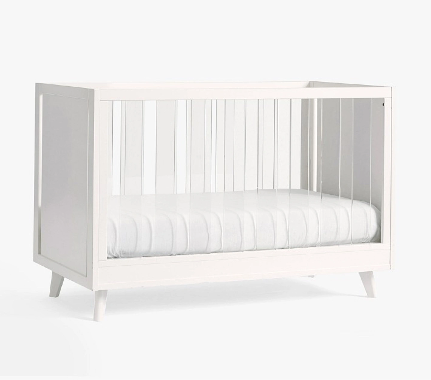 21Convertible crib that converts into a toddler bed. Features a clear acrylic slat system and white finish. Includes conversion kit. Purchased from Pottery Barn for $1500 +tax In excellent condition.
