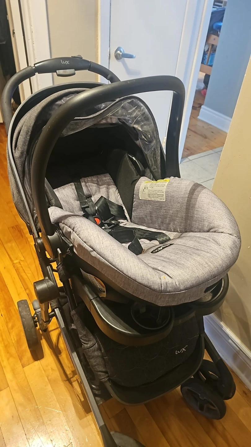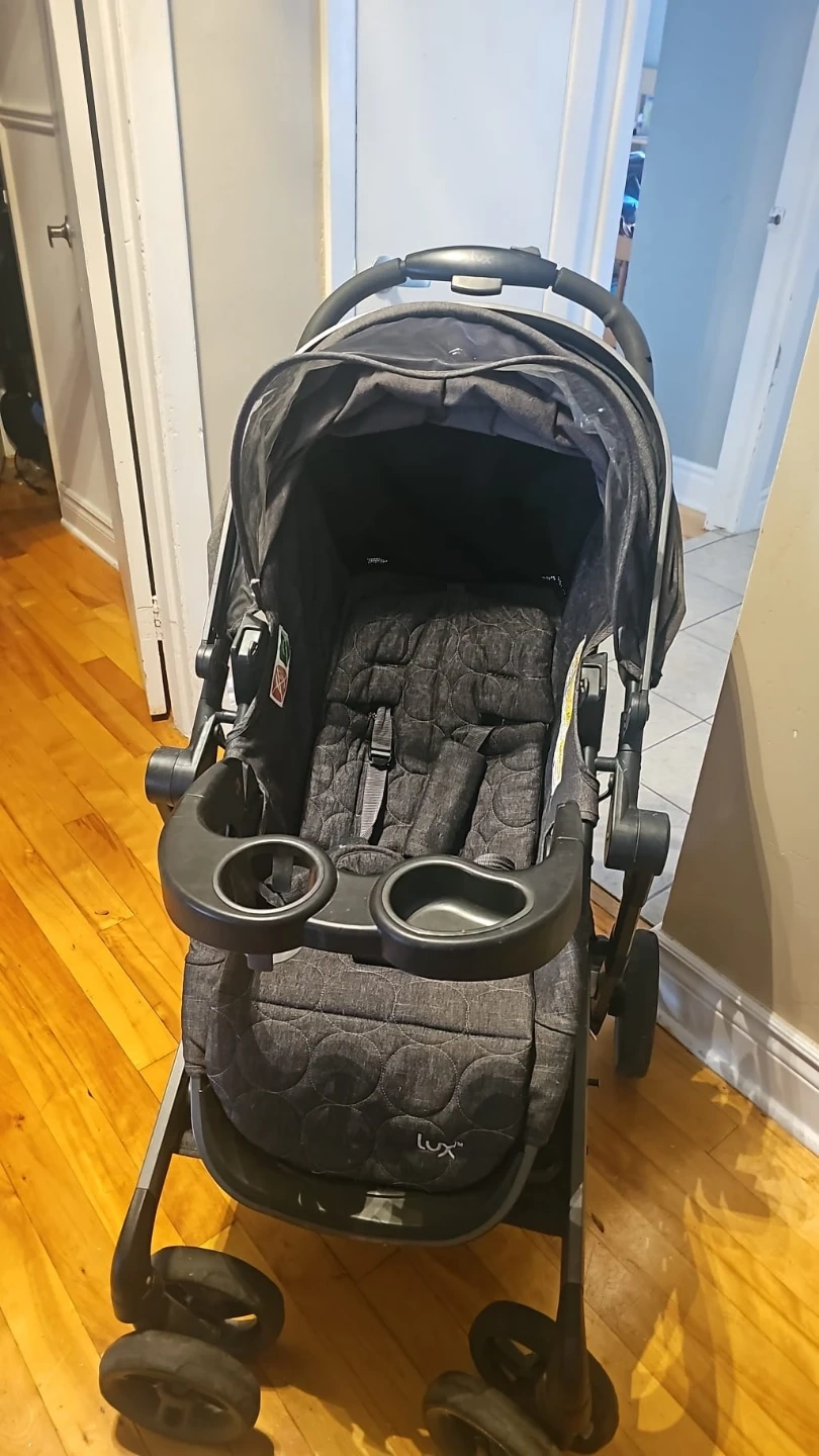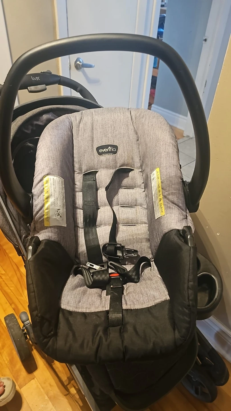 20Je vends une poussette Evenflo LUX. Elle est en bonne condition et parfaite pour les promenades avec votre enfant! Elle est de couleur grise et noire. Elle a un siège d'auto Evenflo inclus.
