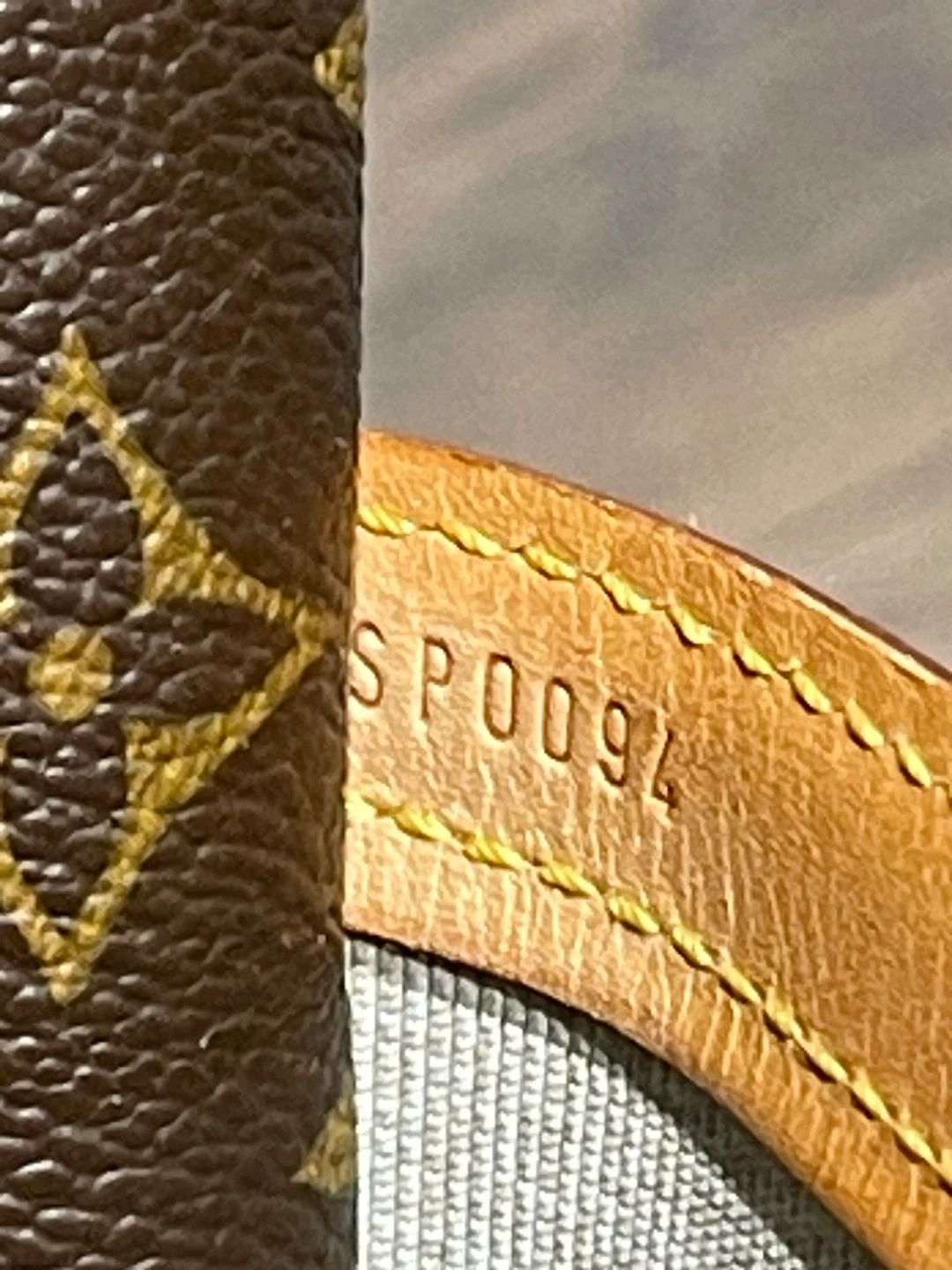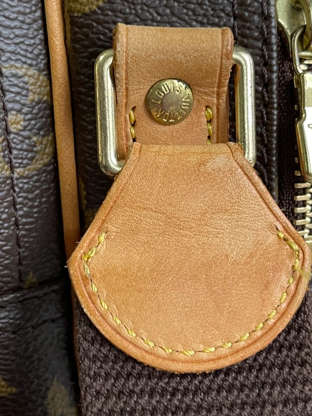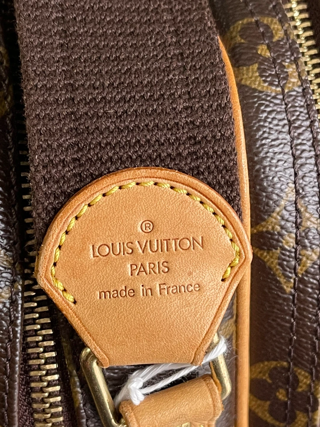 Classic Louis Vuitton monogram shoulder bag. Made in France from coated canvas and leather trim. Features a zip-top closure and adjustable strap. This stylish bag is perfect for everyday use.