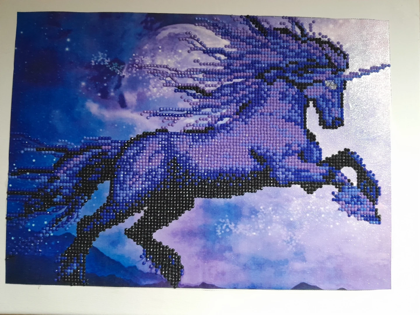 Unfinished diamond painting kit featuring a majestic purple unicorn against a starry, cosmic background. It's a beautiful piece for any fantasy art enthusiast. This kit includes everything needed to create a sparkling wall art.