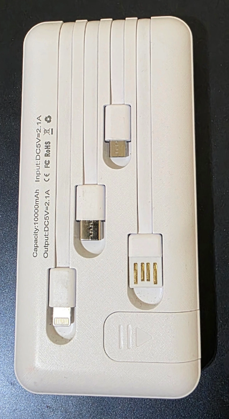 62Selling a handy power bank that comes with built-in cables! It's super convenient since you don't have to carry extra cords around. The power bank has a capacity of 10000mAh and an output of DC5V=2.1A. It also has a display showing the battery percentage.
