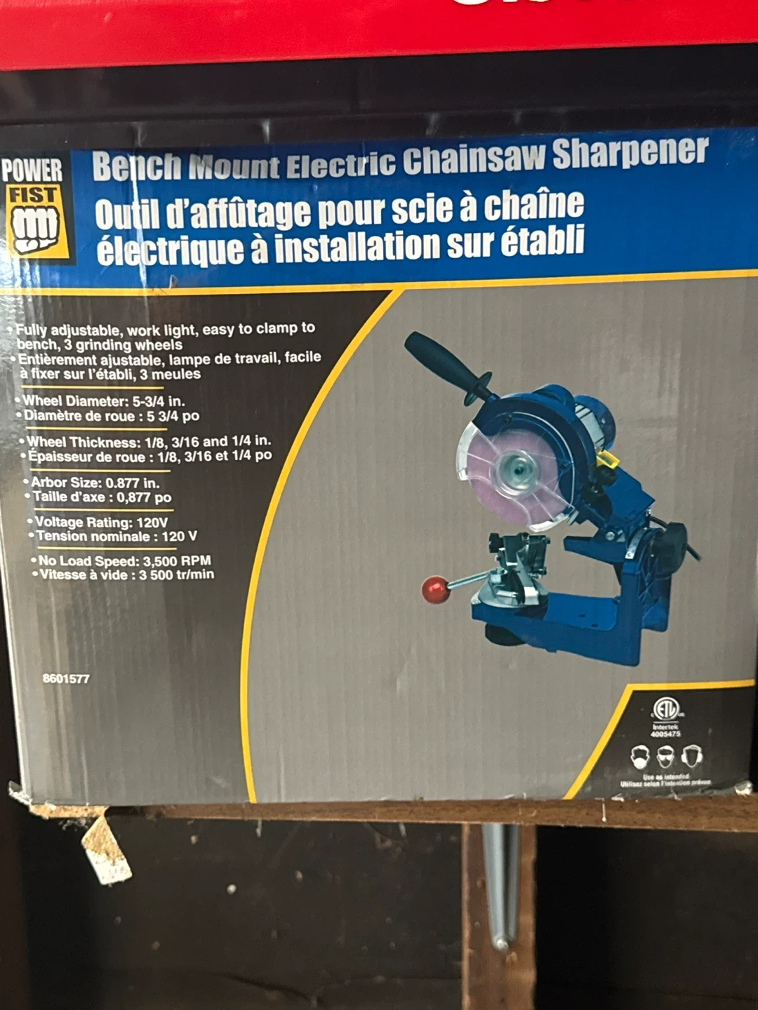 Selling a Power Fist bench mount electric chainsaw sharpener. It's fully adjustable and easy to clamp to your bench. It also features a work light and comes with 3 grinding wheels. Key specs: - Wheel Diameter: 5-3/4 in - Wheel Thickness: 1/8, 3/16, and 1/4 in - Arbor Size: 0.877 in - Voltage Rating: 120V - No Load Speed: 3,500 RPM