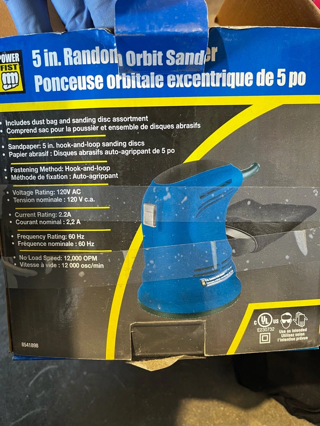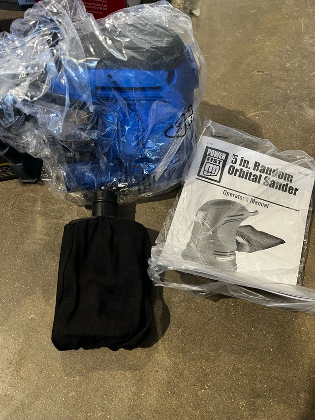 15This Power Fist 5-inch random orbit sander is great for getting a smooth finish on woodworking projects, and this one is new in the box! It operates at 120V AC and features a hook-and-loop fastening method for easy sandpaper changes. Originally bought it for $100 tax included Features: * 5-inch hook-and-loop sanding disc * 120V AC operation * 12,000 OPM (oscillations per minute) * Includes dust bag and sanding disc assortment