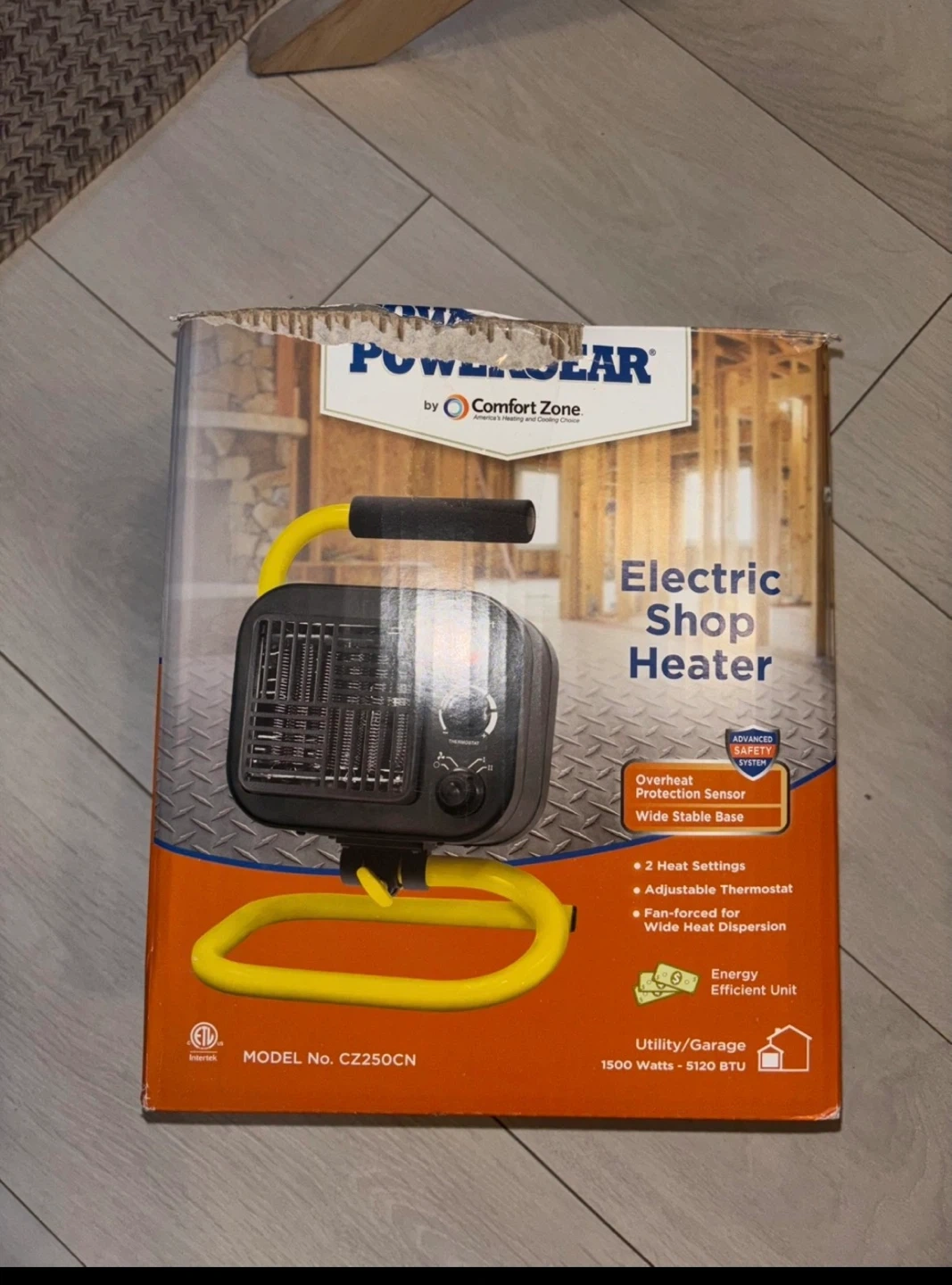 Selling a Power Gear Electric Shop Heater by Comfort Zone, model CZ250CN. It has an overheat protection sensor and a wide, stable base. It also features 2 heat settings and an adjustable thermostat for reinforced wide heat dispersion. It's an energy-efficient unit perfect for a utility room or garage. 1500 Watts - 5120 BTU
