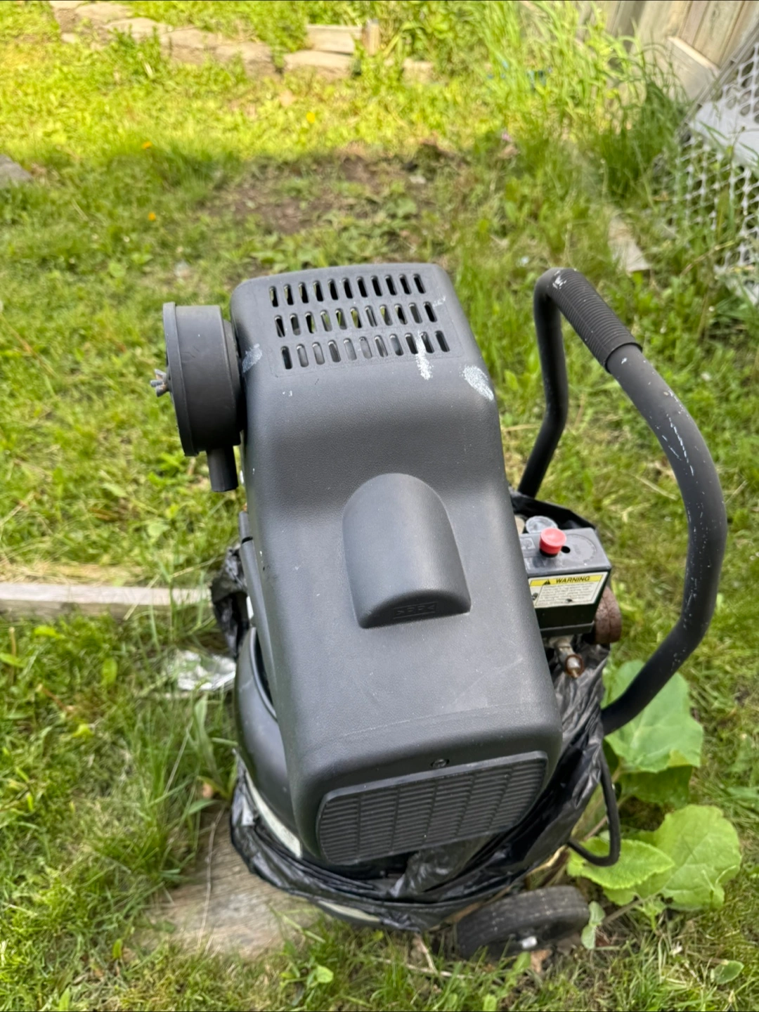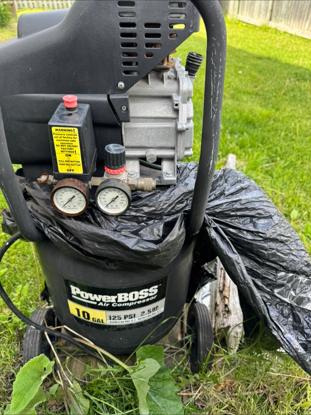 3510 gallon air compressor. 125 PSI, 2.5 HP. Features two gauges and a pressure regulator. Shows some wear. Wheels for portability. Includes carry handle. not working sell As Is