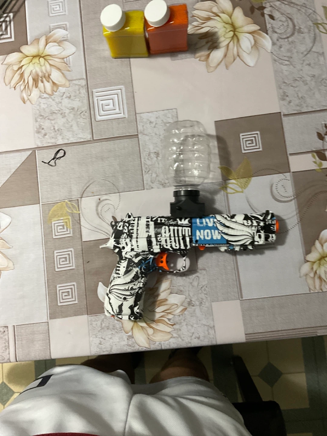 This is a gel ball blaster toy gun with a cool graphic design. It comes with gel ammo in yellow and orange, a battery, and a USB charging cable. Pickup only.