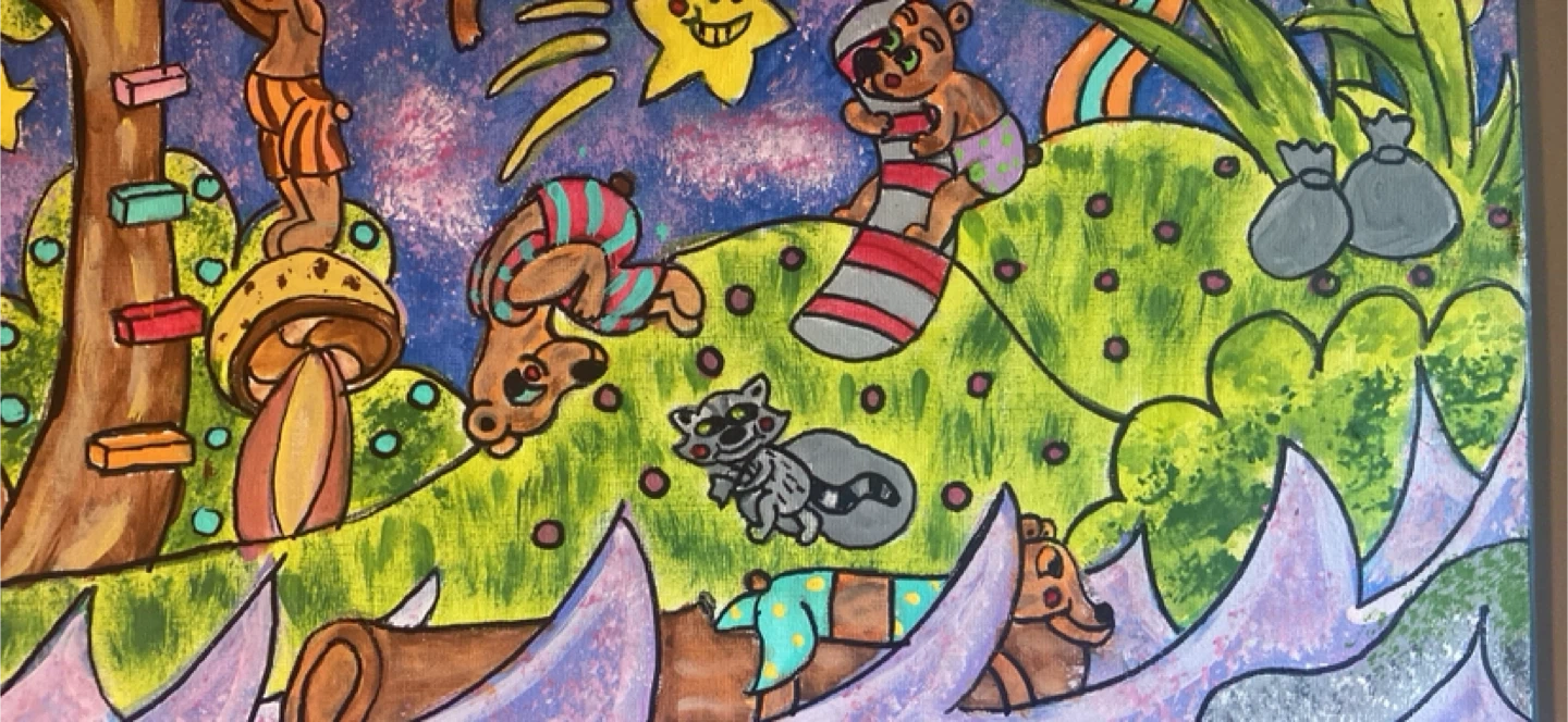 A whimsical canvas print featuring cartoon bears, a smiling moon, and colourful mushrooms. It's a vibrant piece perfect for a child's room! The art depicts a playful scene with apples on a tree and animals by the water.