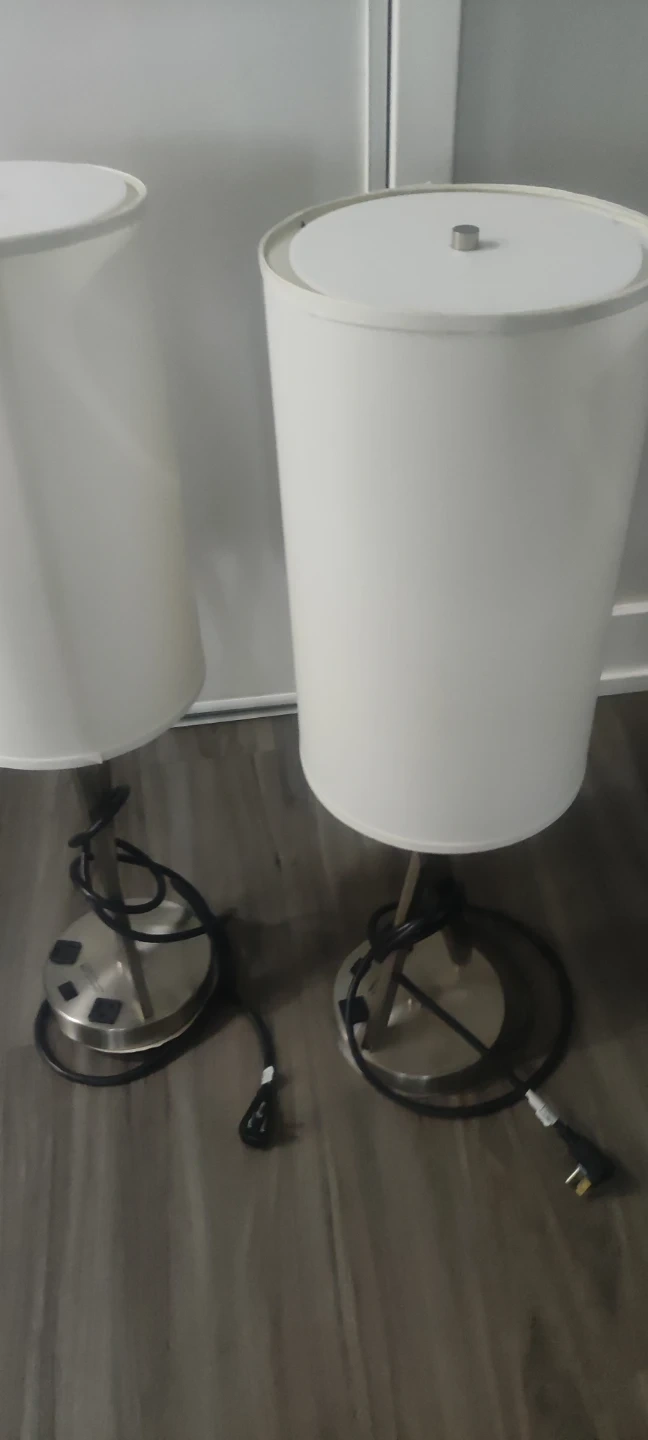 Selling a pair of table lamps. They are white with a cylindrical shade and a silver base. Great for bedside tables or living room lighting