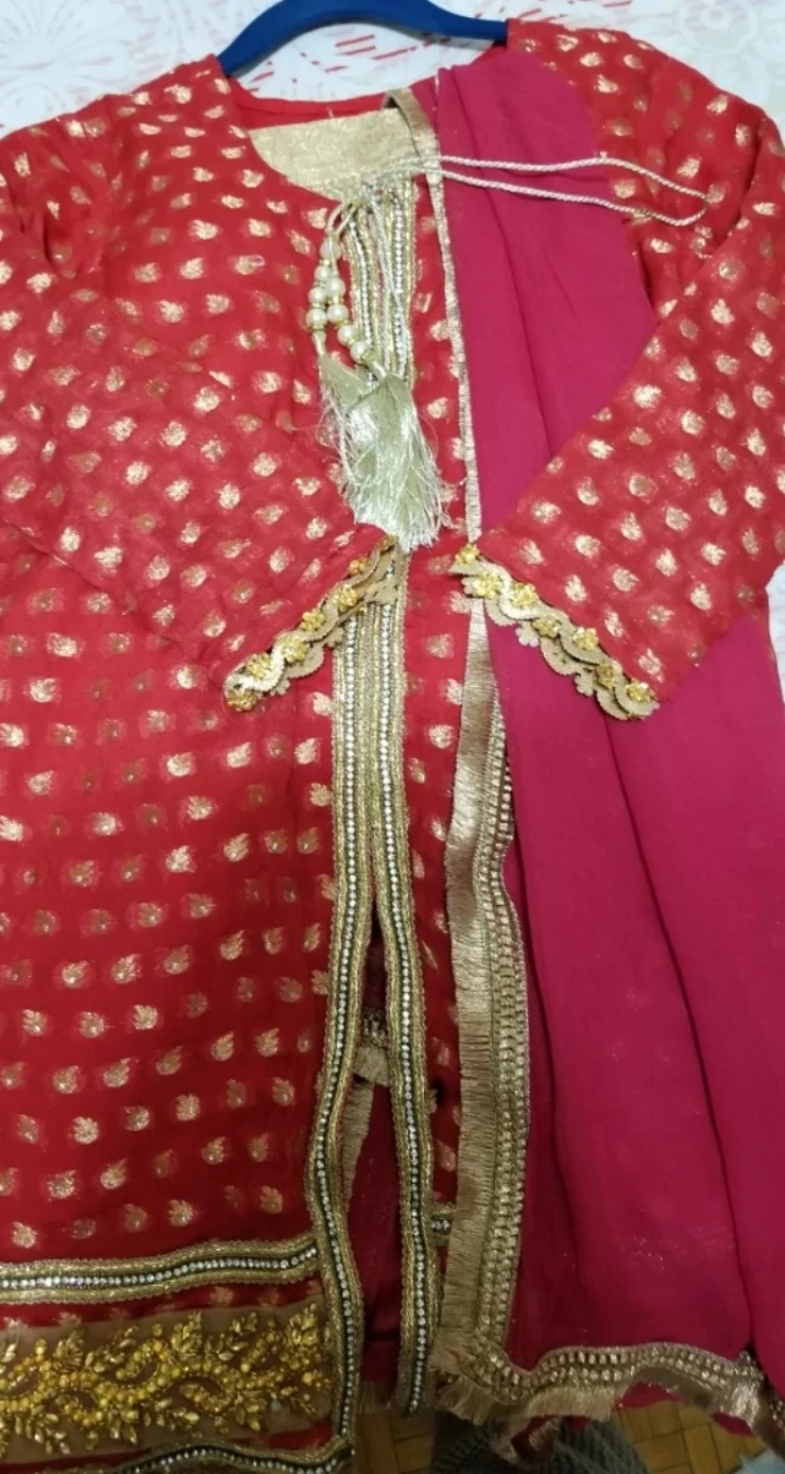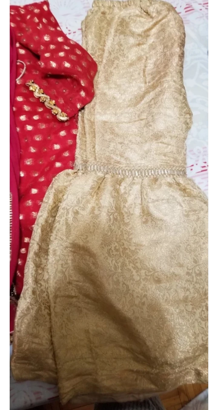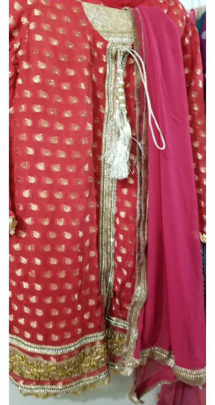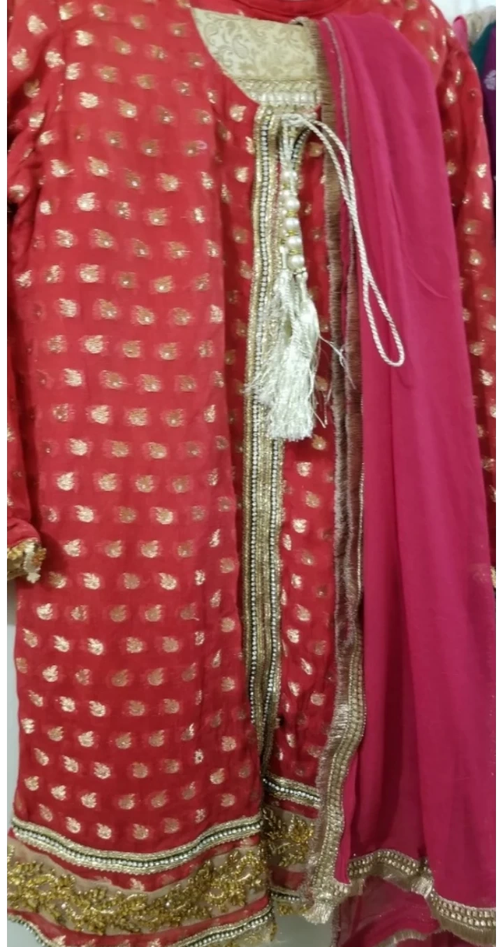 Beautiful red and gold shalwar kameez. Features intricate gold detailing. Includes a matching dupatta. Three-piece suit. Elegant and festive.