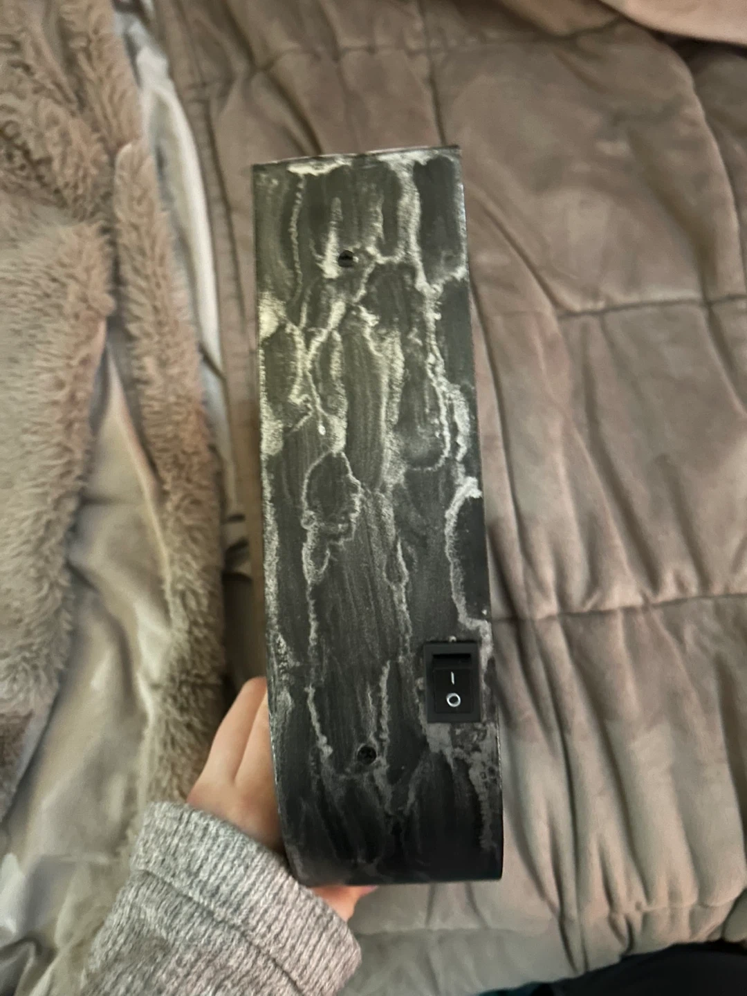 This is a light-up letter J from Studio Decor. It's designed with a rustic wood-look finish and has five built-in LED bulbs. It requires 2 AA batteries including the ones that came with the product at purchase.