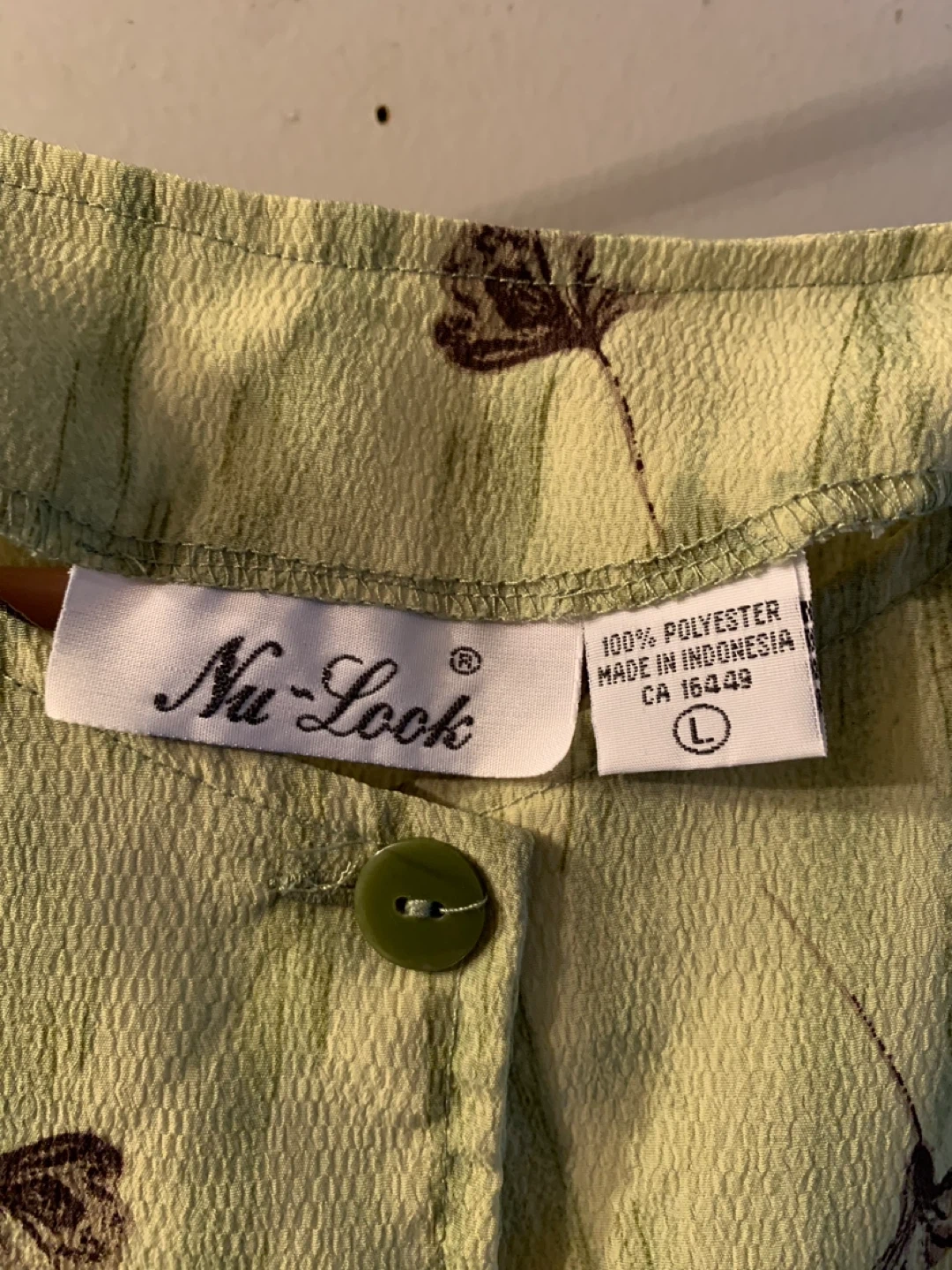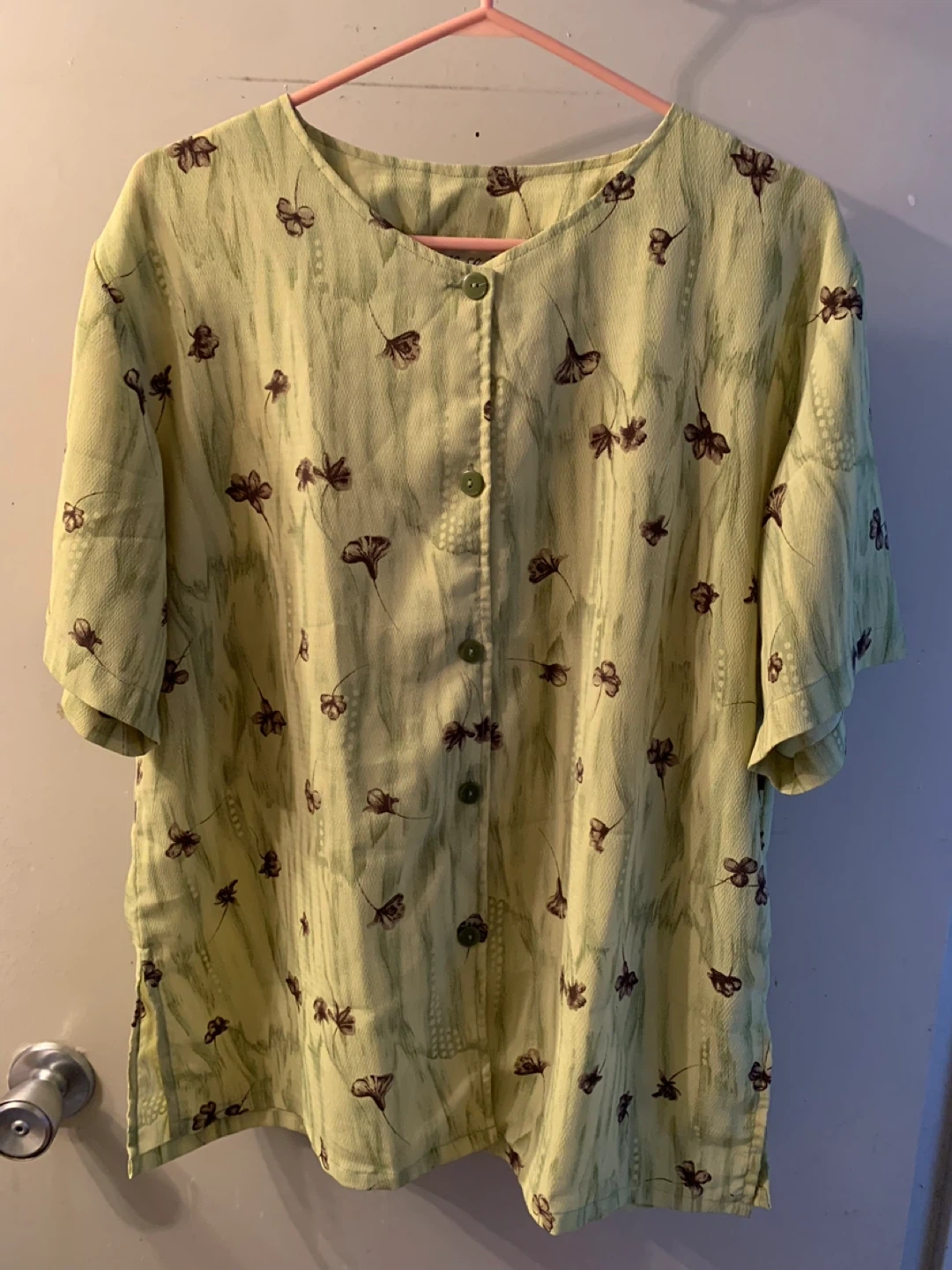 Light green blouse from Nu-Look with a floral print. Made of 100% polyester. It's a size large with short sleeves and button-up front. This top is perfect for casual wear!