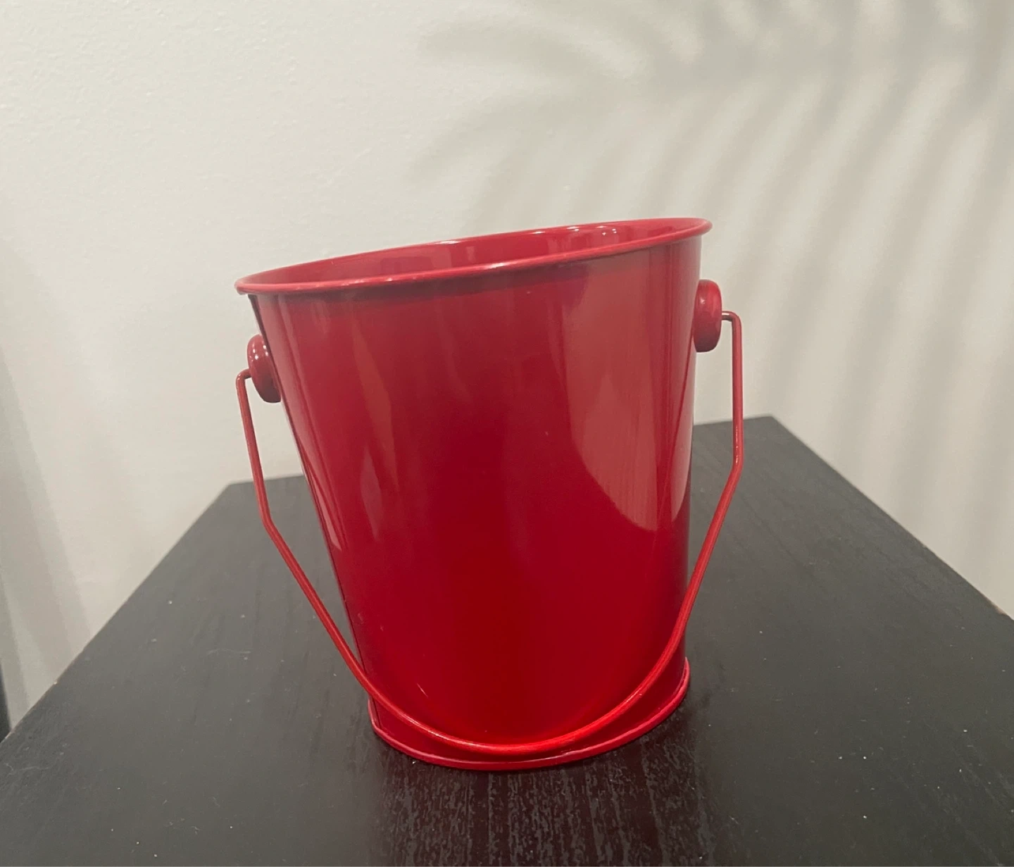 This is a small red metal bucket. It has a wire handle for carrying. It's suitable for decorative use or small storage. Its bright color adds a festive touch!