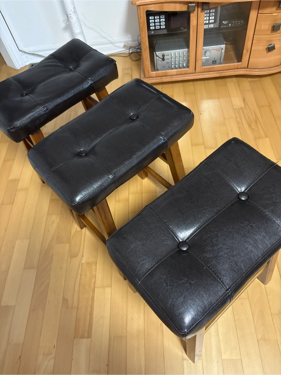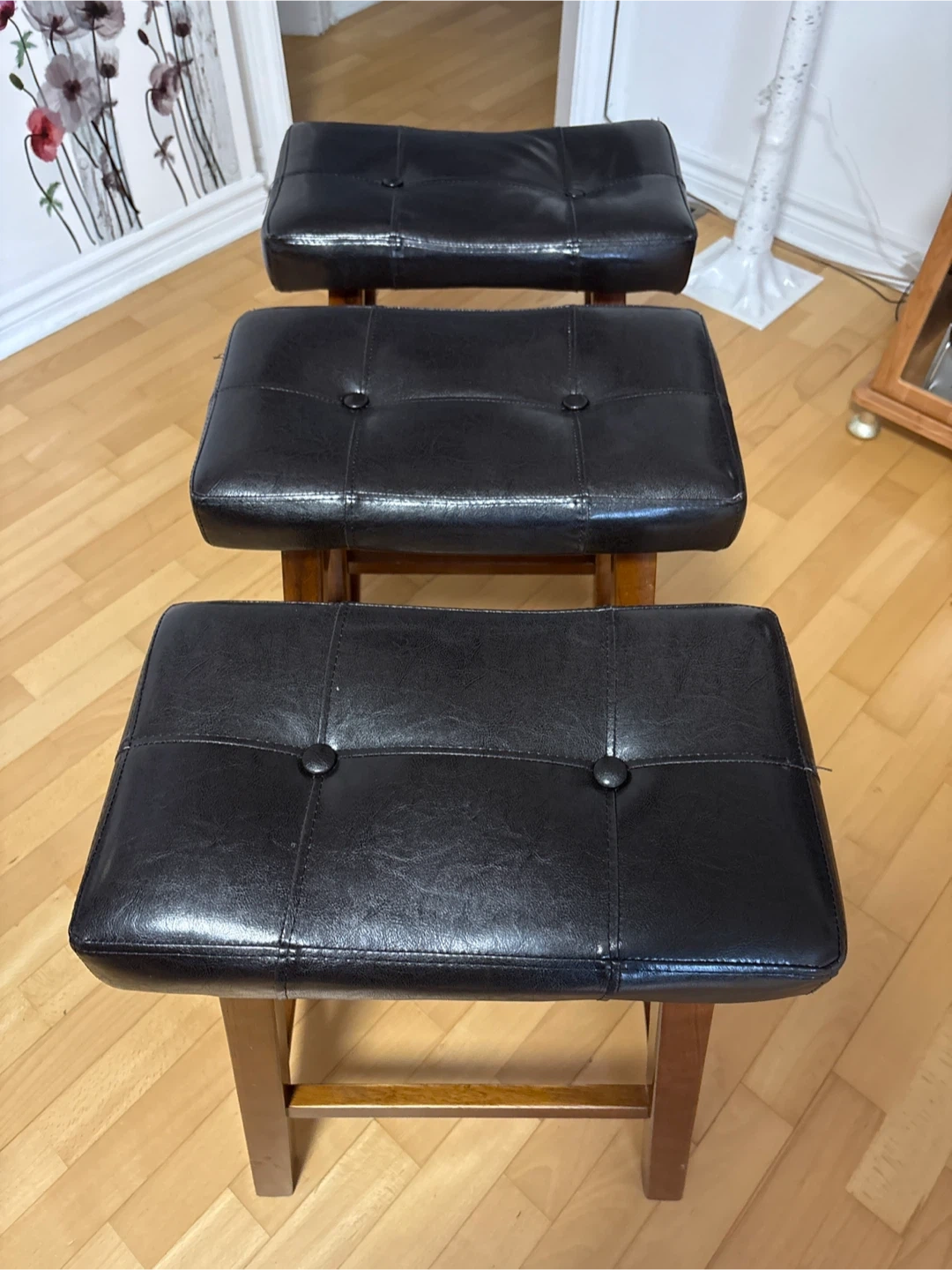 For sale: a set of three counter stools with black tufted faux leather seats and wooden frames. These stools would be great for a kitchen island or home bar, offering both sturdiness and comfort for everyday use. One stool has chipped legs. $20 for all three.