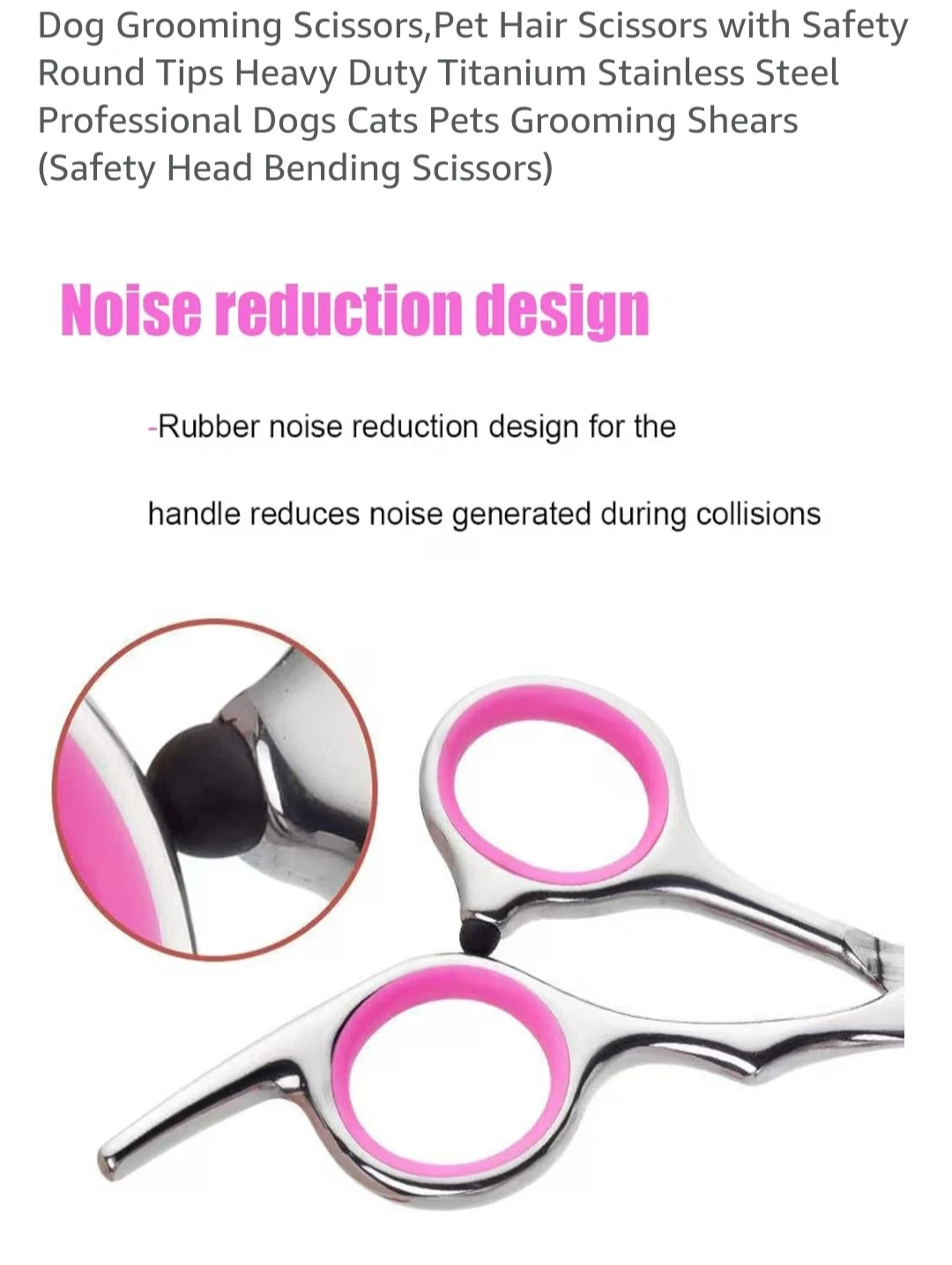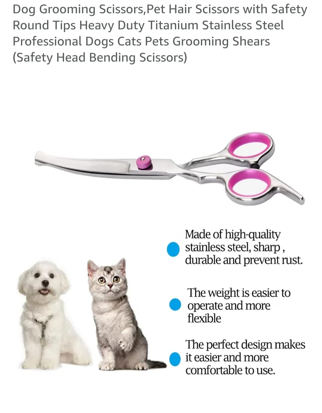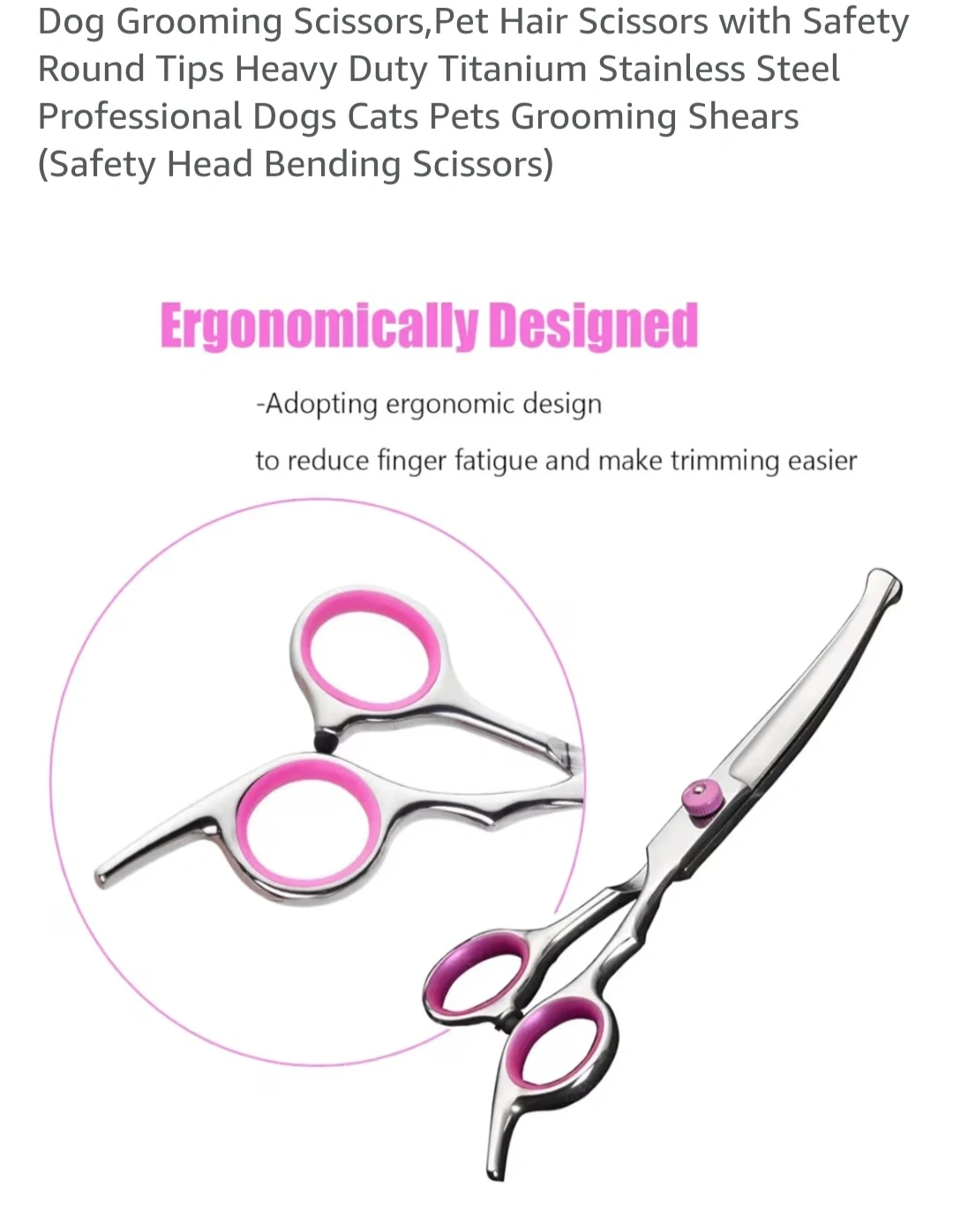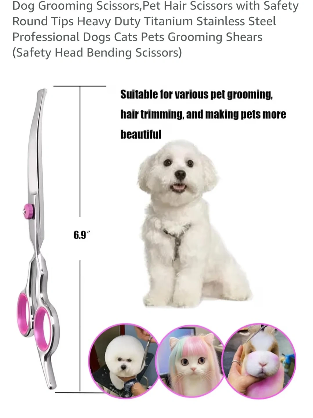$10 ea stainless steel grooming scissors designed for pets. They feature pink finger loops and safety round tips for safe grooming. The overall length is 6.9 inches.