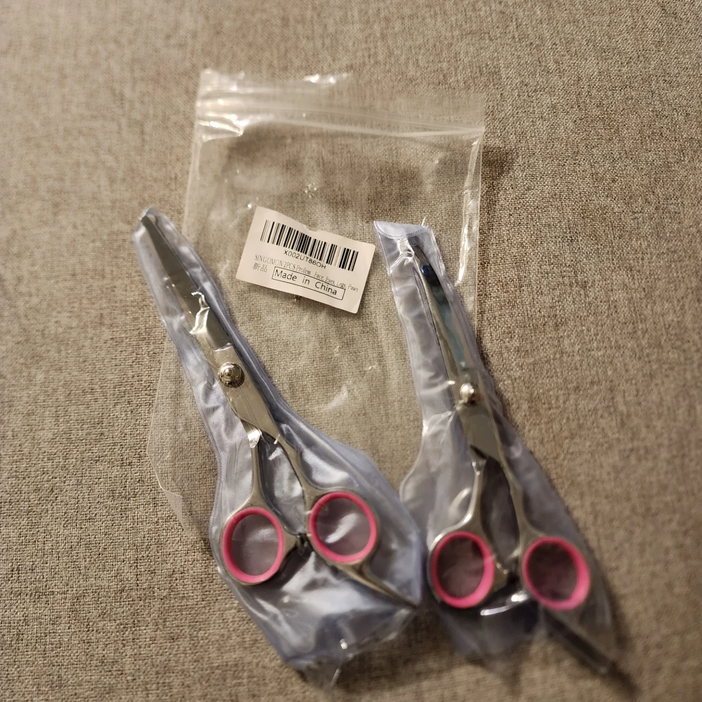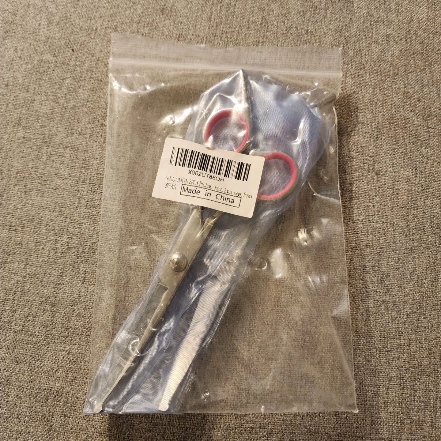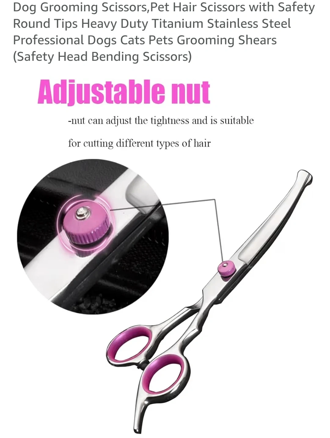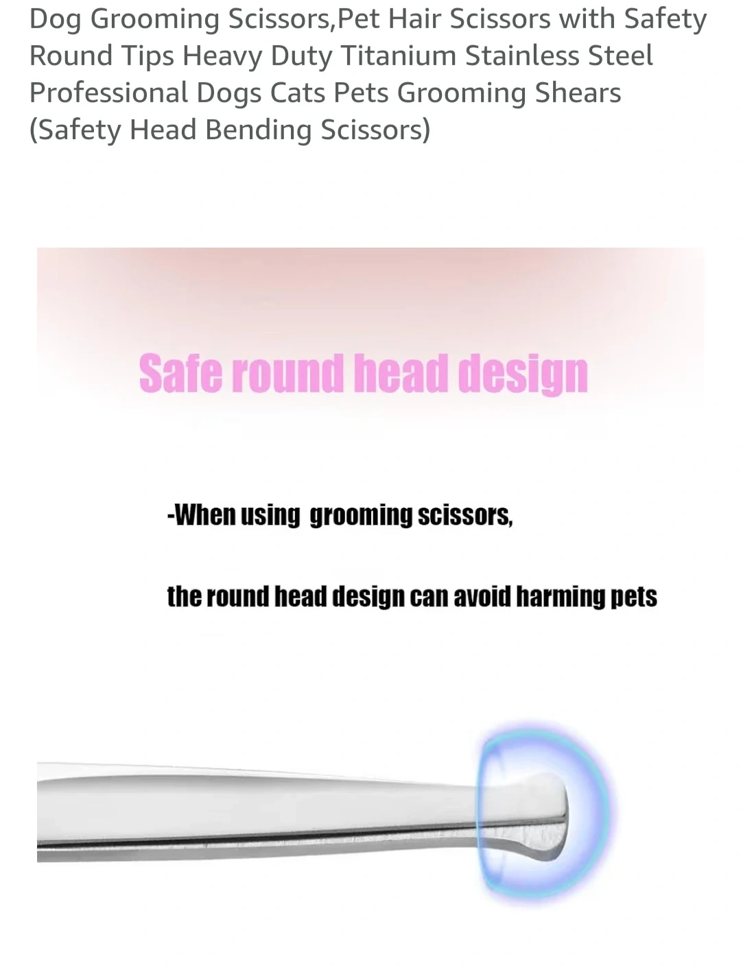 $10 ea stainless steel grooming scissors designed for pets. They feature pink finger loops and safety round tips for safe grooming. The overall length is 6.9 inches.