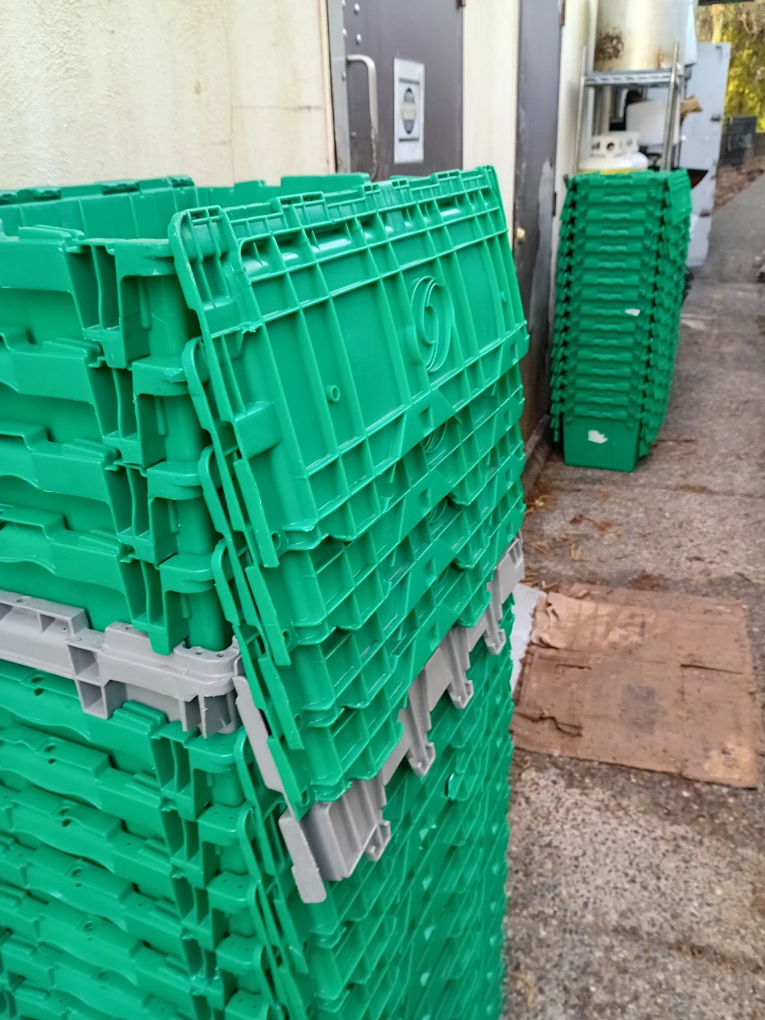 Selling a set of 10 sturdy green stackable storage totes. These totes are designed for efficient storage and transport, with a durable plastic construction. They interlock securely when stacked, making them ideal for moving, organizing garages, or storing seasonal items. Totes measure approximately 21" L x 19" W x 12" H.