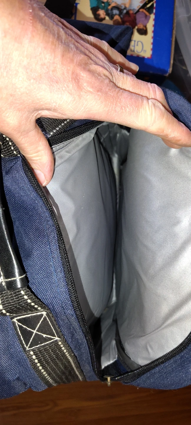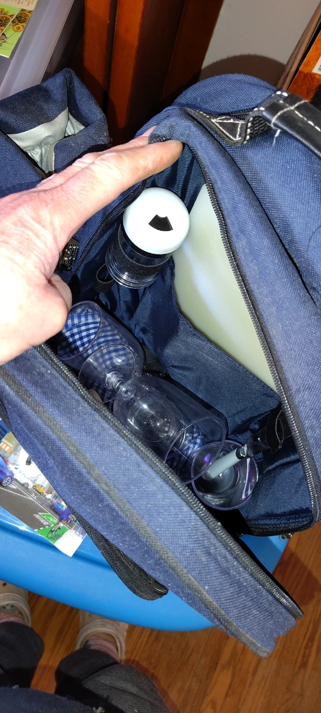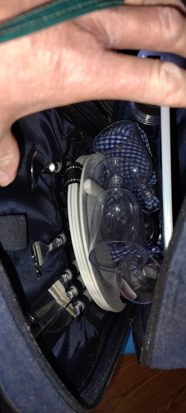 This blue picnic backpack is insulated to keep your food and drinks cool. It comes with cutlery, plates, and glasses for four people. There's also a separate compartment for a bottle. It's great for day trips or outdoor gatherings!