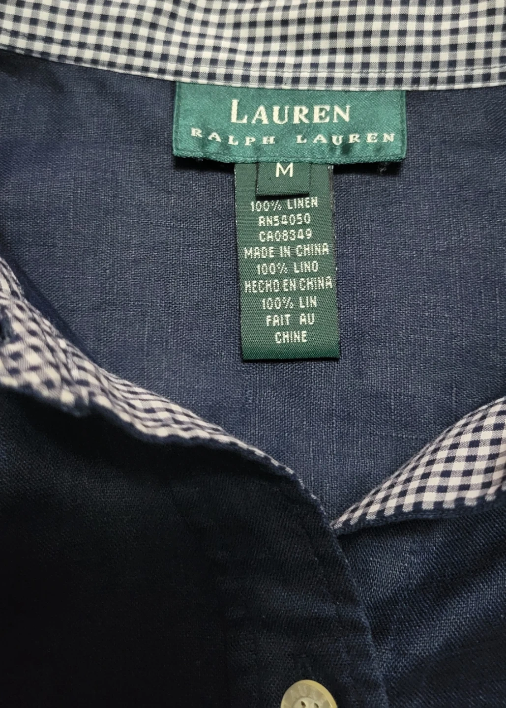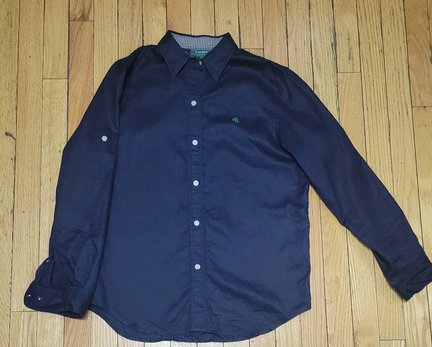 Lauren Ralph Lauren button-up shirt. Made from 100% linen. It's a size medium in navy. Features a gingham collar and cuffs.