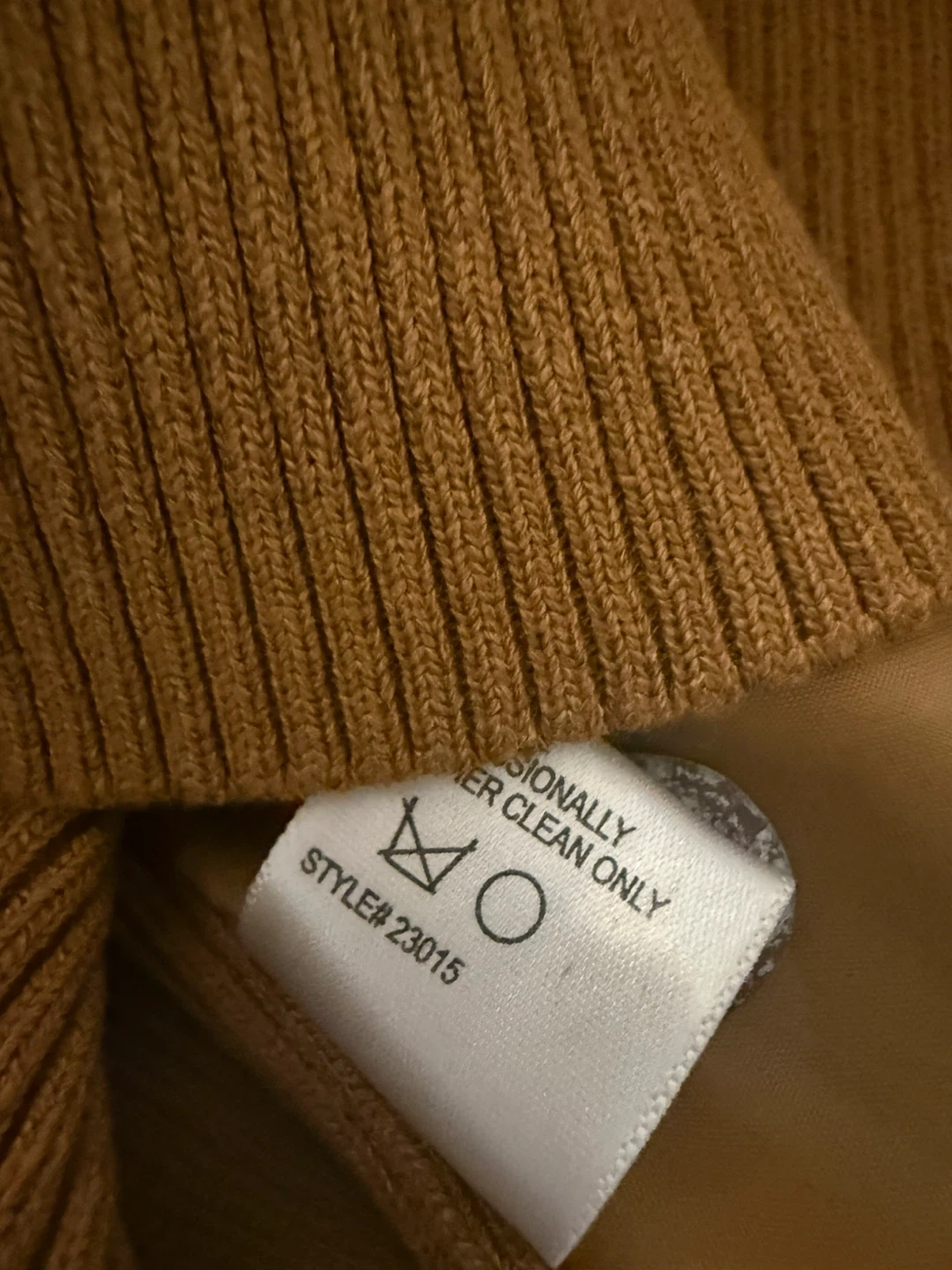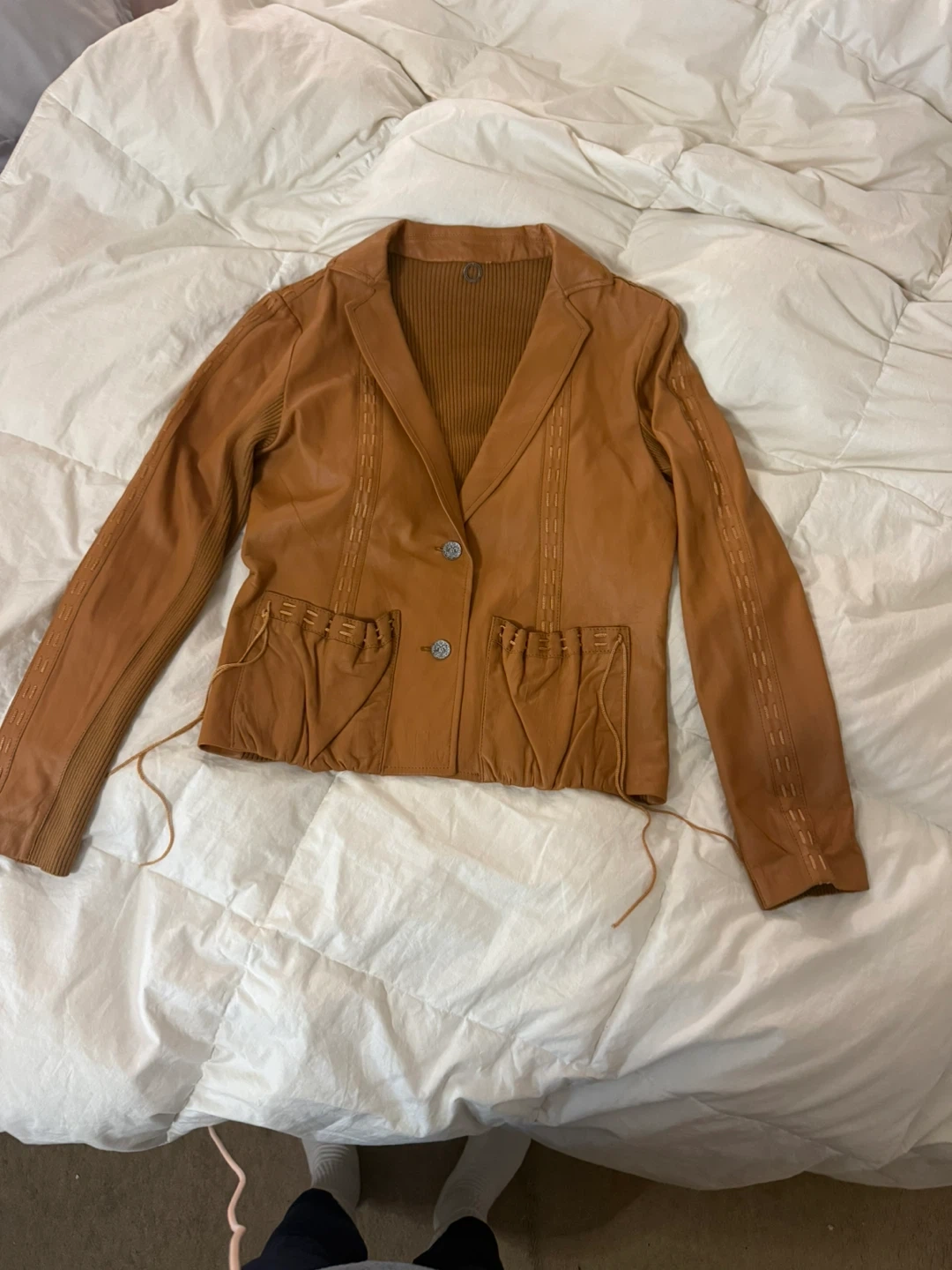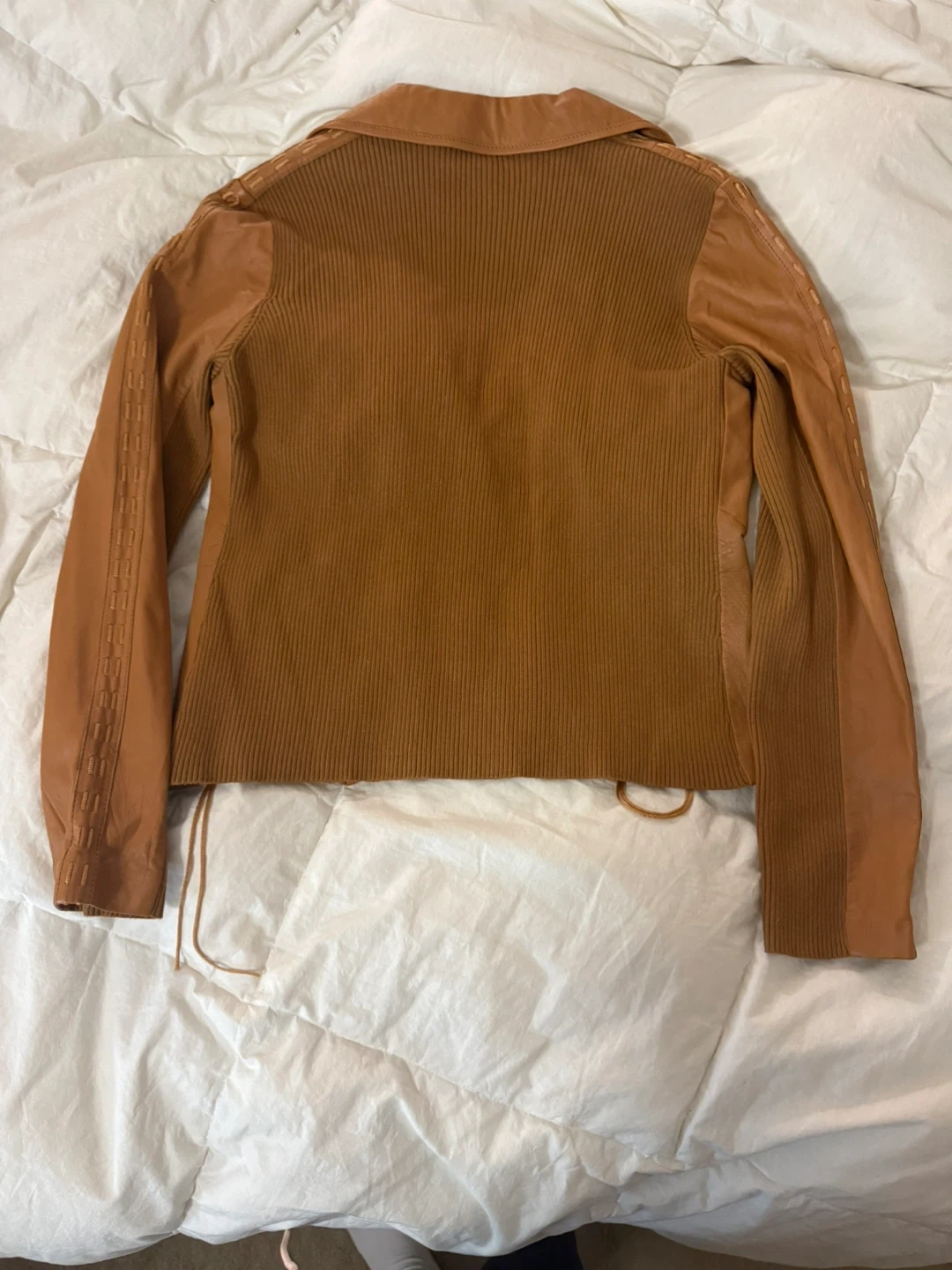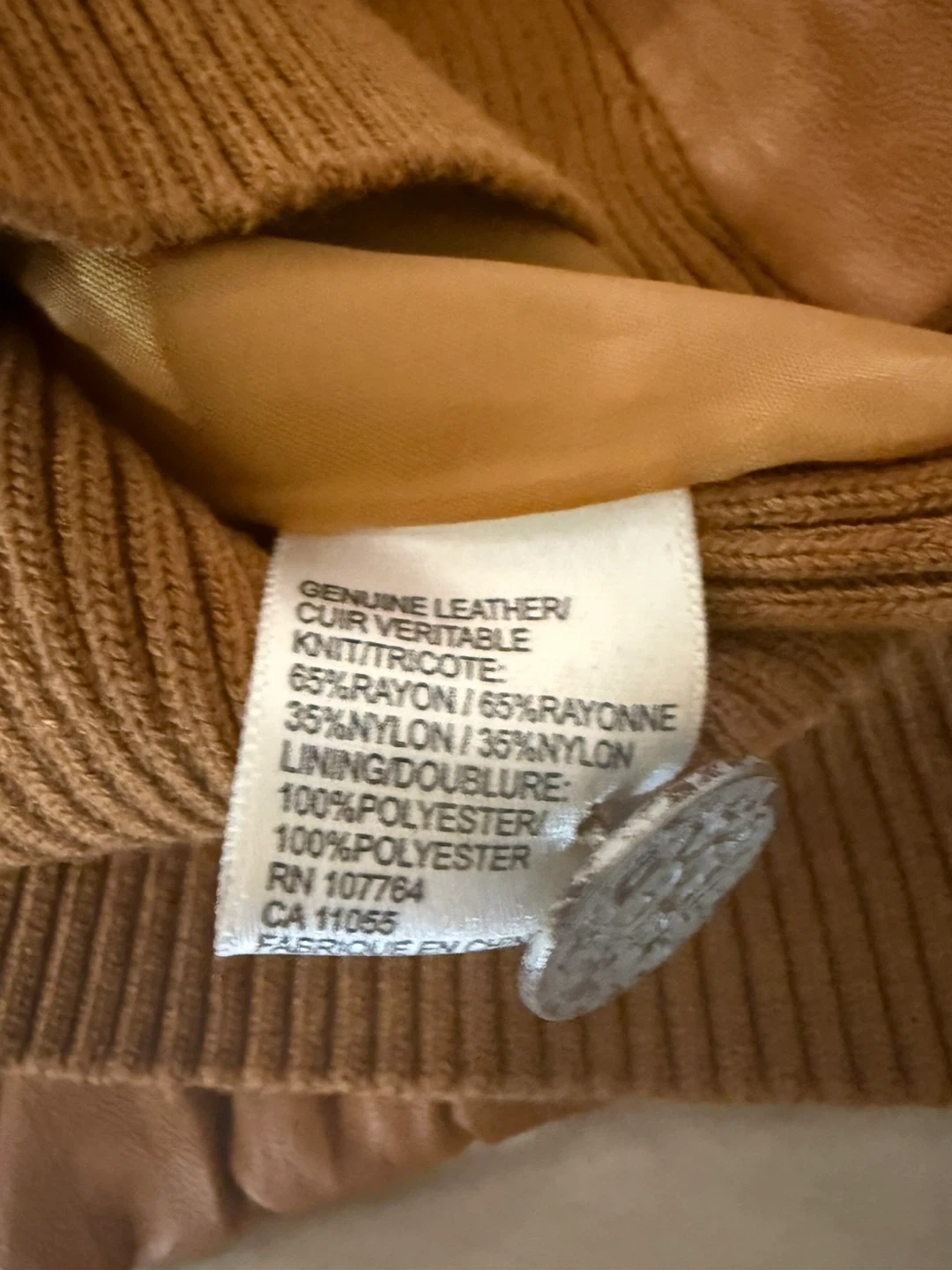 Genuine leather and knit jacket. 65% rayon, 35% nylon sleeves. 100% polyester lining. This jacket is great for layering during transitional weather!