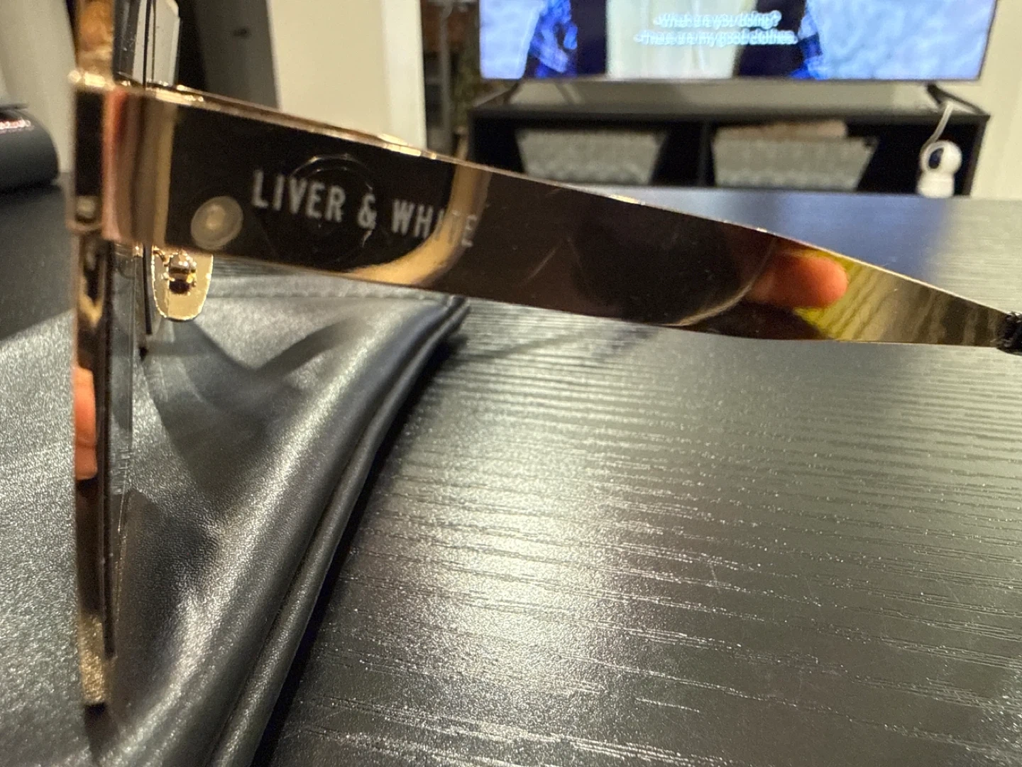 Selling a pair of Liver & White sunglasses in gold! These sunglasses have a unique, stylish look and come with a case to keep them protected. They're in great condition and ready for a new owner