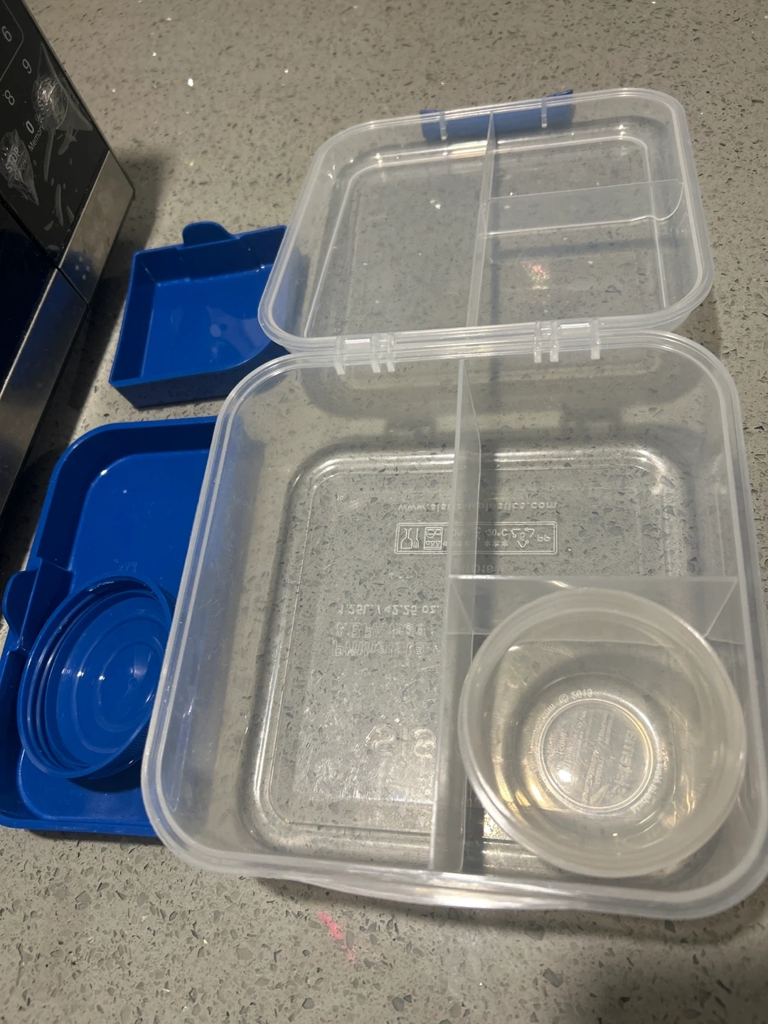Sistema blue bento box with multiple compartments and a screw-top round container. BPA-free plastic construction. Perfect for packing lunches for school or work!