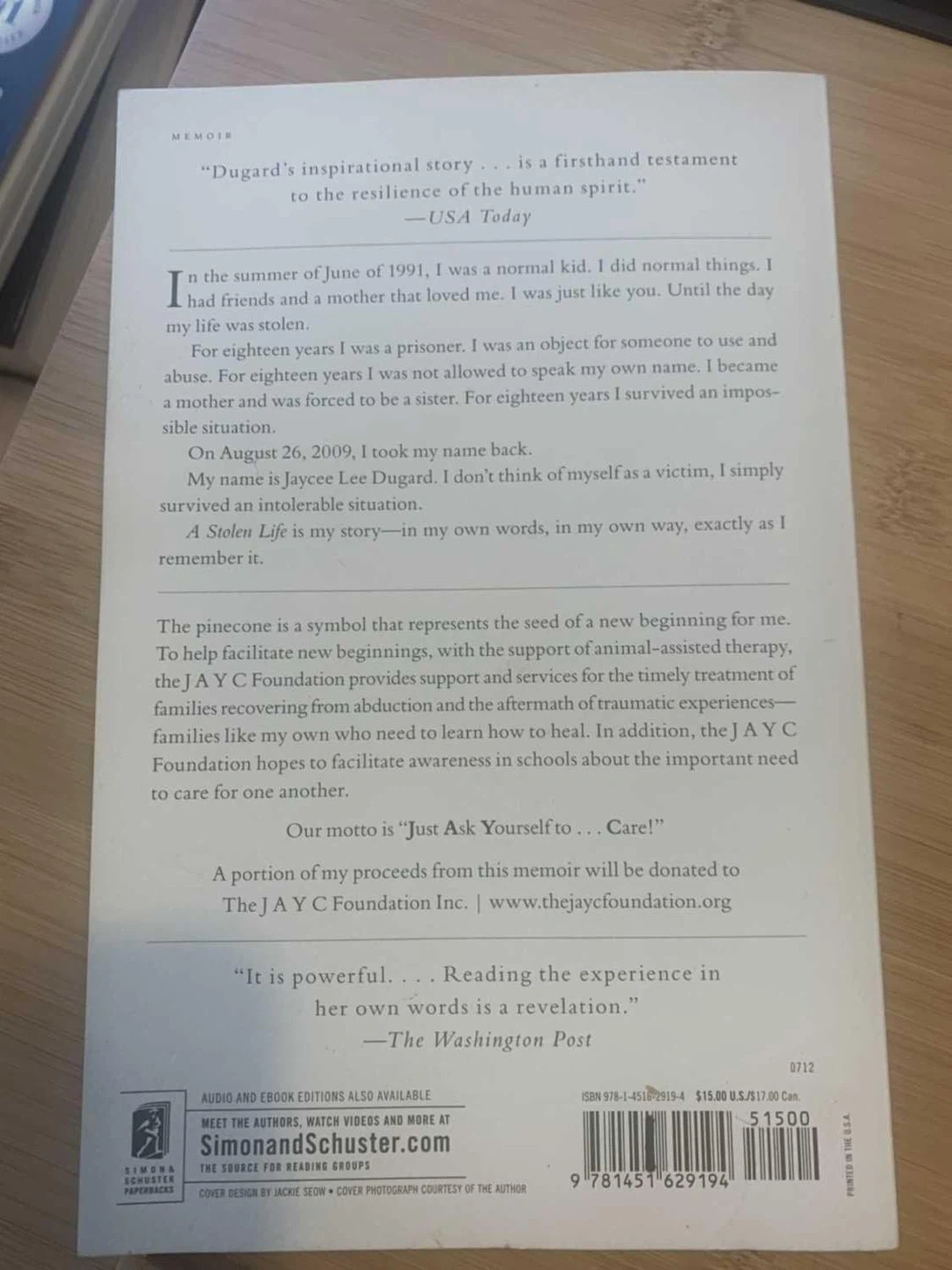 This is Jaycee Dugard's memoir, 'A Stolen Life'. It's an autobiography detailing her experiences. A portion of the proceeds from this book are donated to The JAYC Foundation Inc.