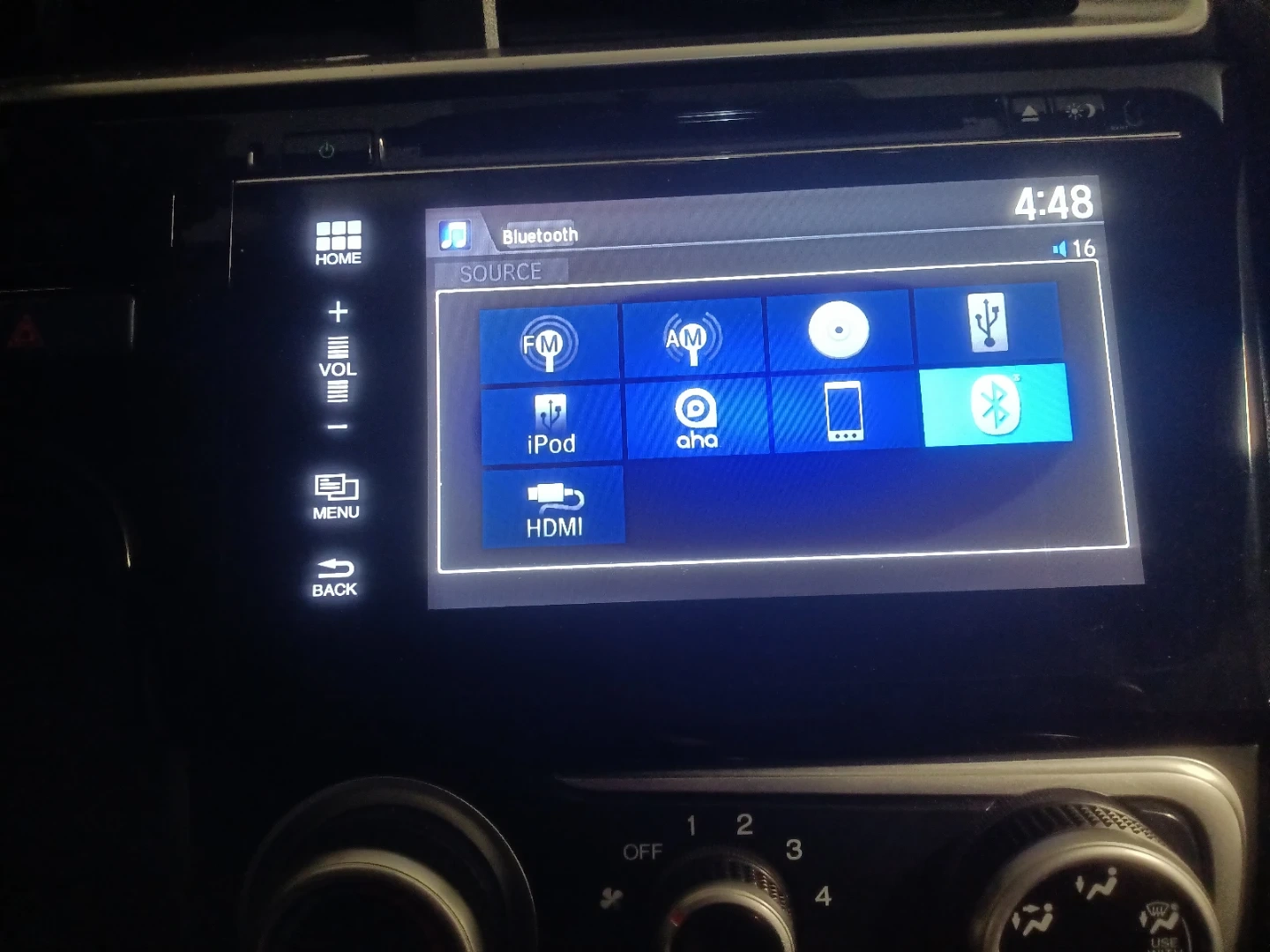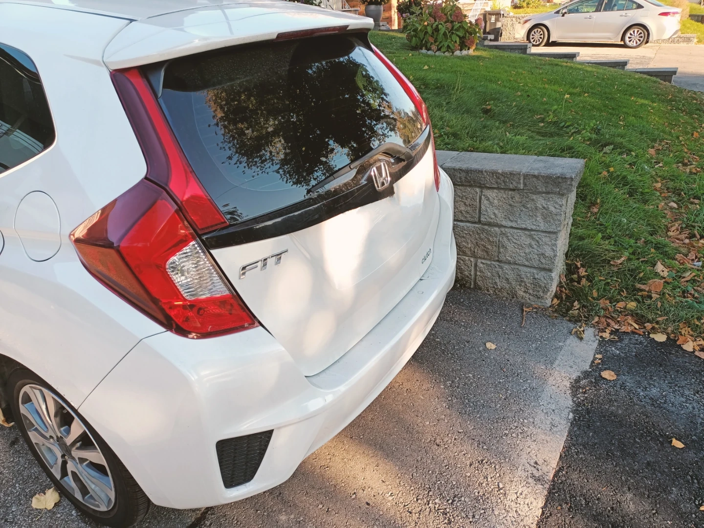 White Honda Fit hatchback. It's a four-door vehicle. Includes touch screen display,