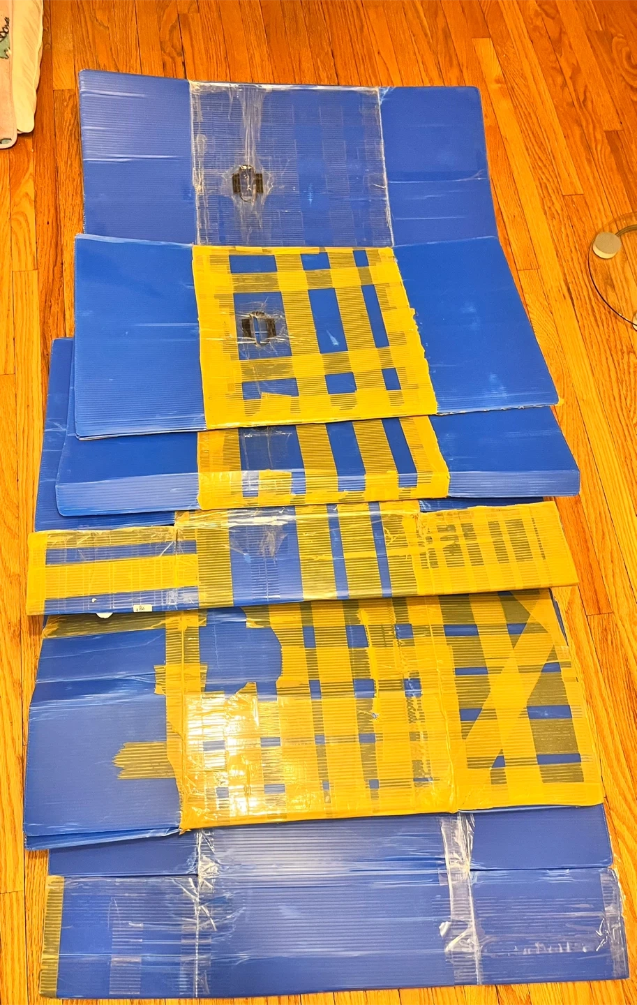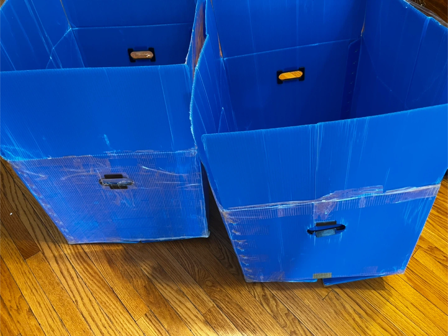 Ten blue plastic storage, moving boxes .built-in handles for easy carrying. These reusable containers are great for organizing garages, basements, or moving items. They fold flat for convenient storage when not in use.