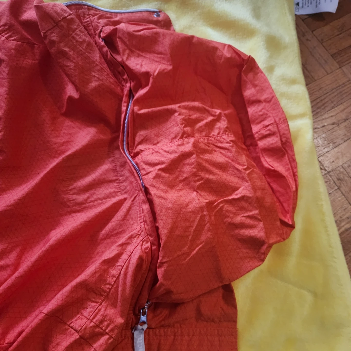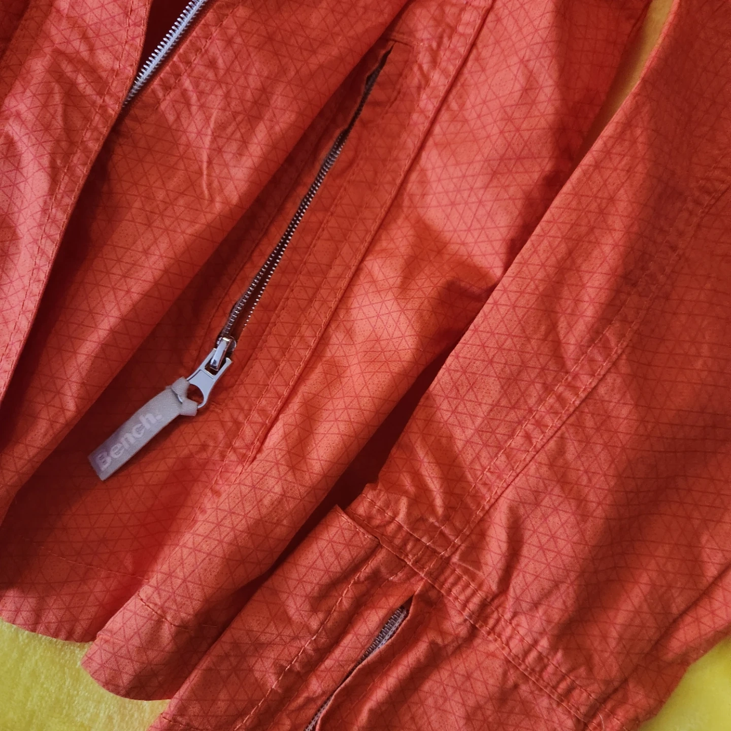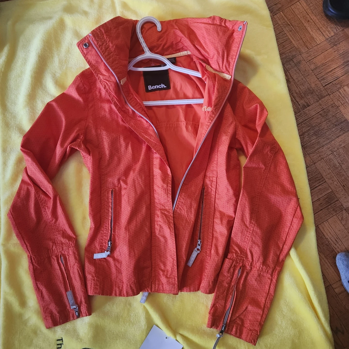 Orange Bench jacket with a full zip closure and a patterned fabric. It's a size small. Great for outdoor activities!