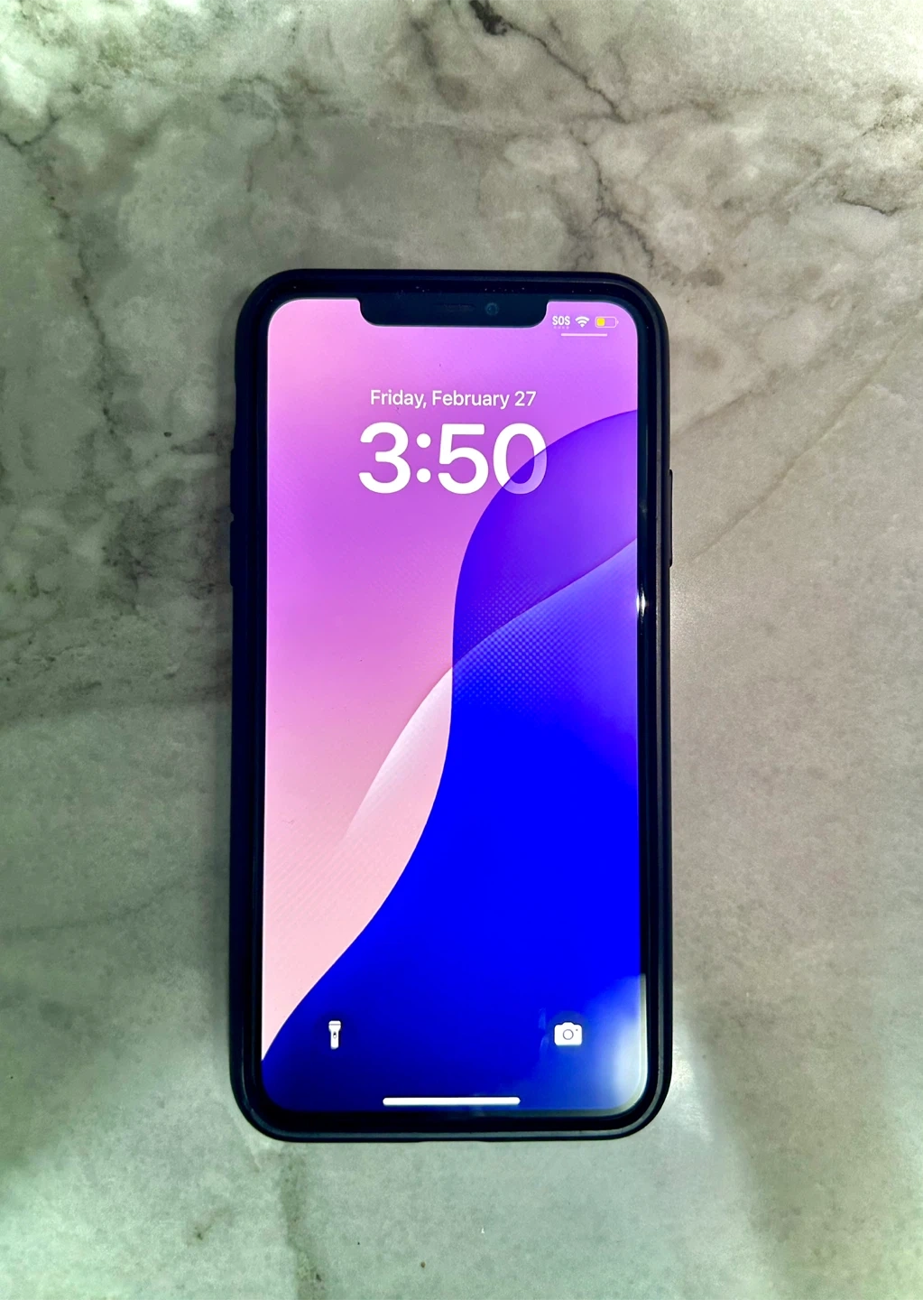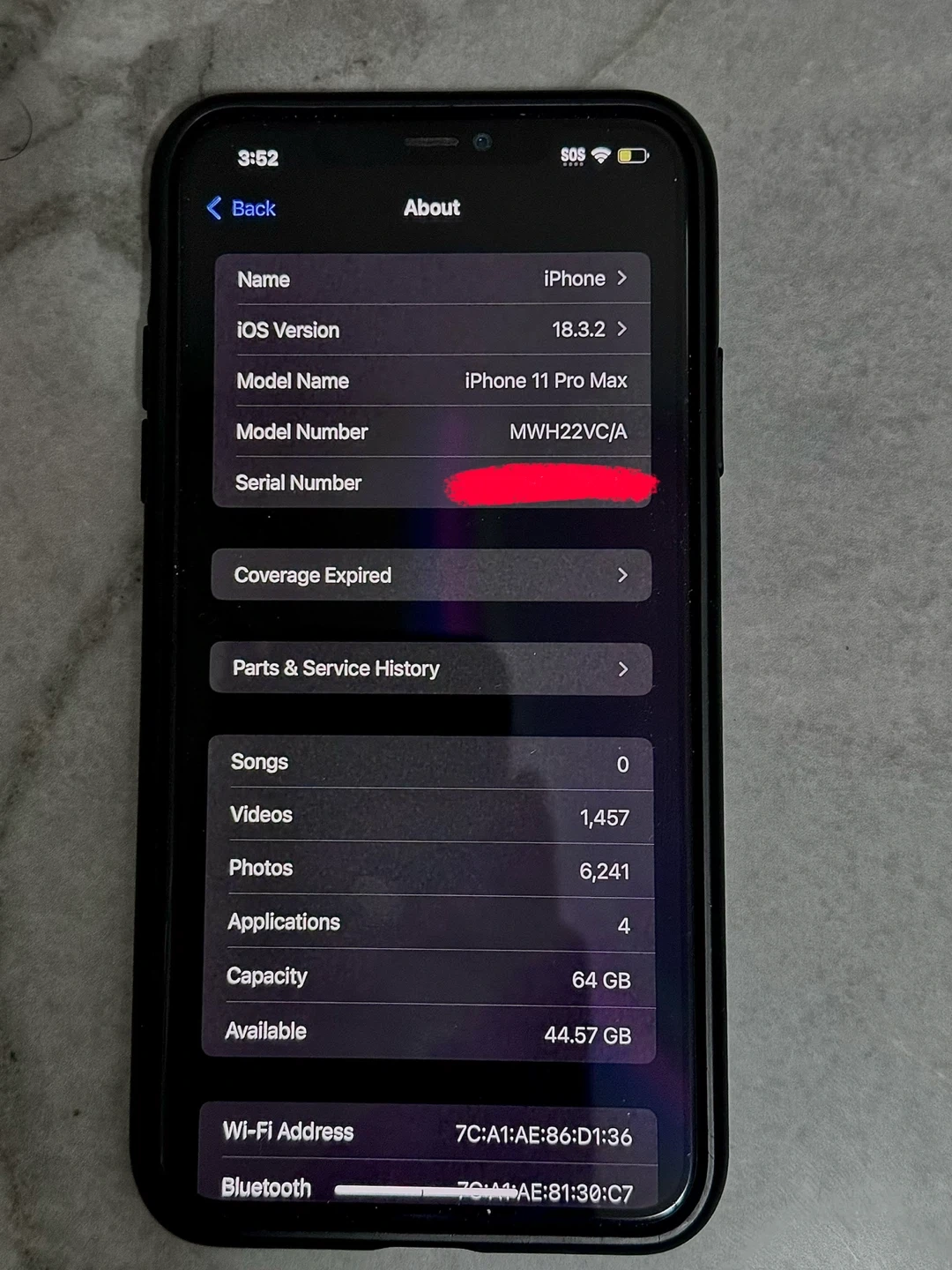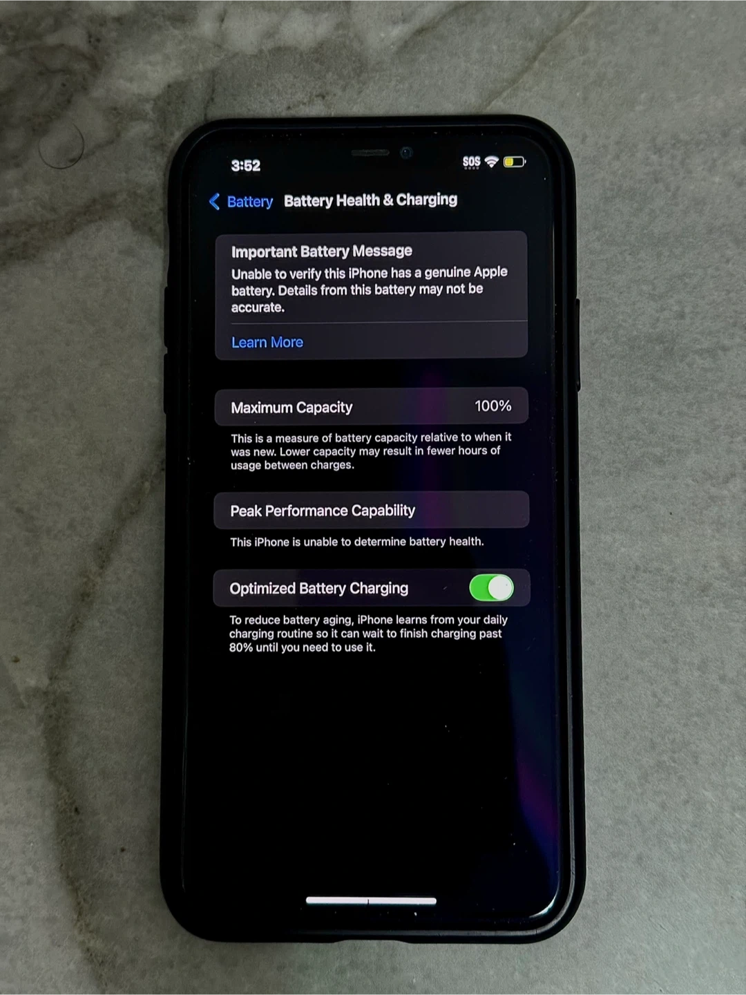 This is an Apple iPhone 11 Pro Max with 64 GB of storage. The battery health is reported at 100% capacity and comes with a case