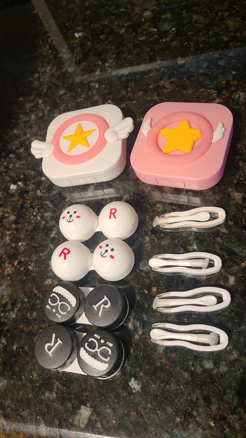 This set includes two cute contact lens cases with mirrors and accessories. It comes with multiple lens holders and tweezer tools for convenience. Perfect for travellers or anyone who wants to keep their lenses organised in style!