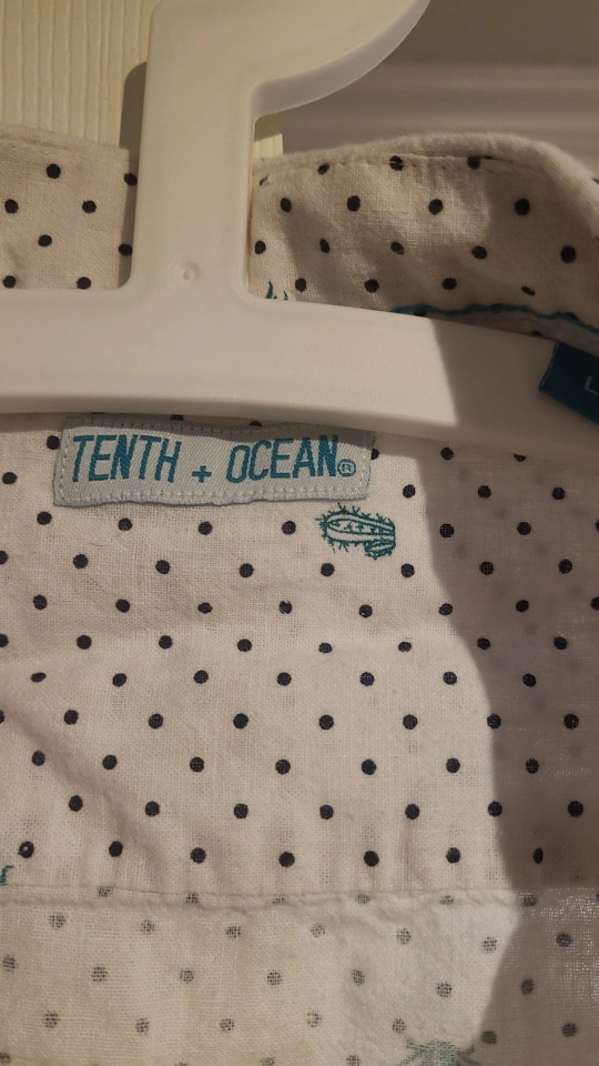 White short-sleeve button-up shirt from Tenth + Ocean. It features a fun black polka dot and cactus pattern. Size is large.