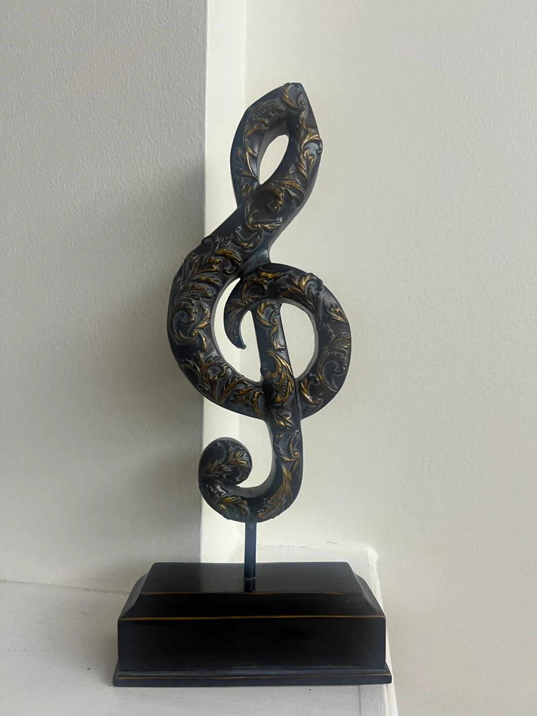 This is a decorative treble clef figurine. It's made of a dark material with ornate gold detailing. The piece sits on a black base.