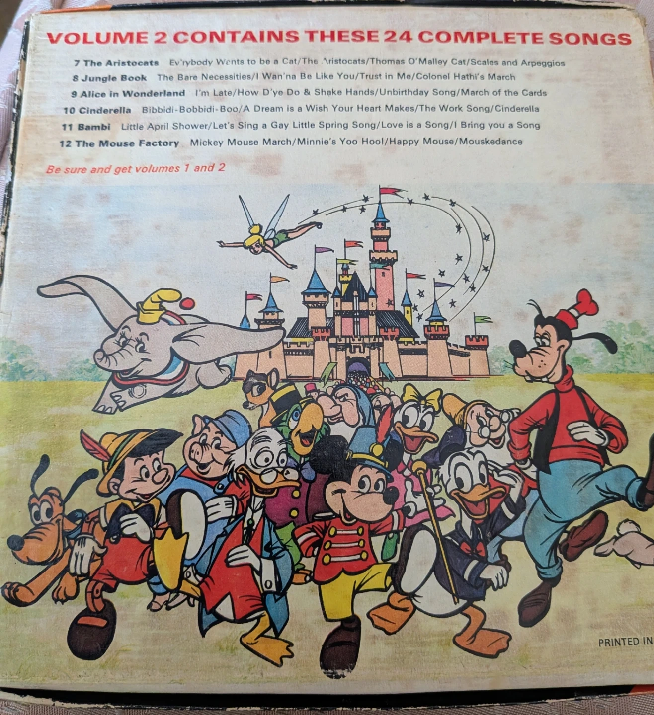 This volume 2 collection features 6 long-playing records with 24 complete songs from Walt Disney. Records are 33 1/3 RPM. Copyright 1972 Walt Disney Productions. Plus 5 additional records from volume 1