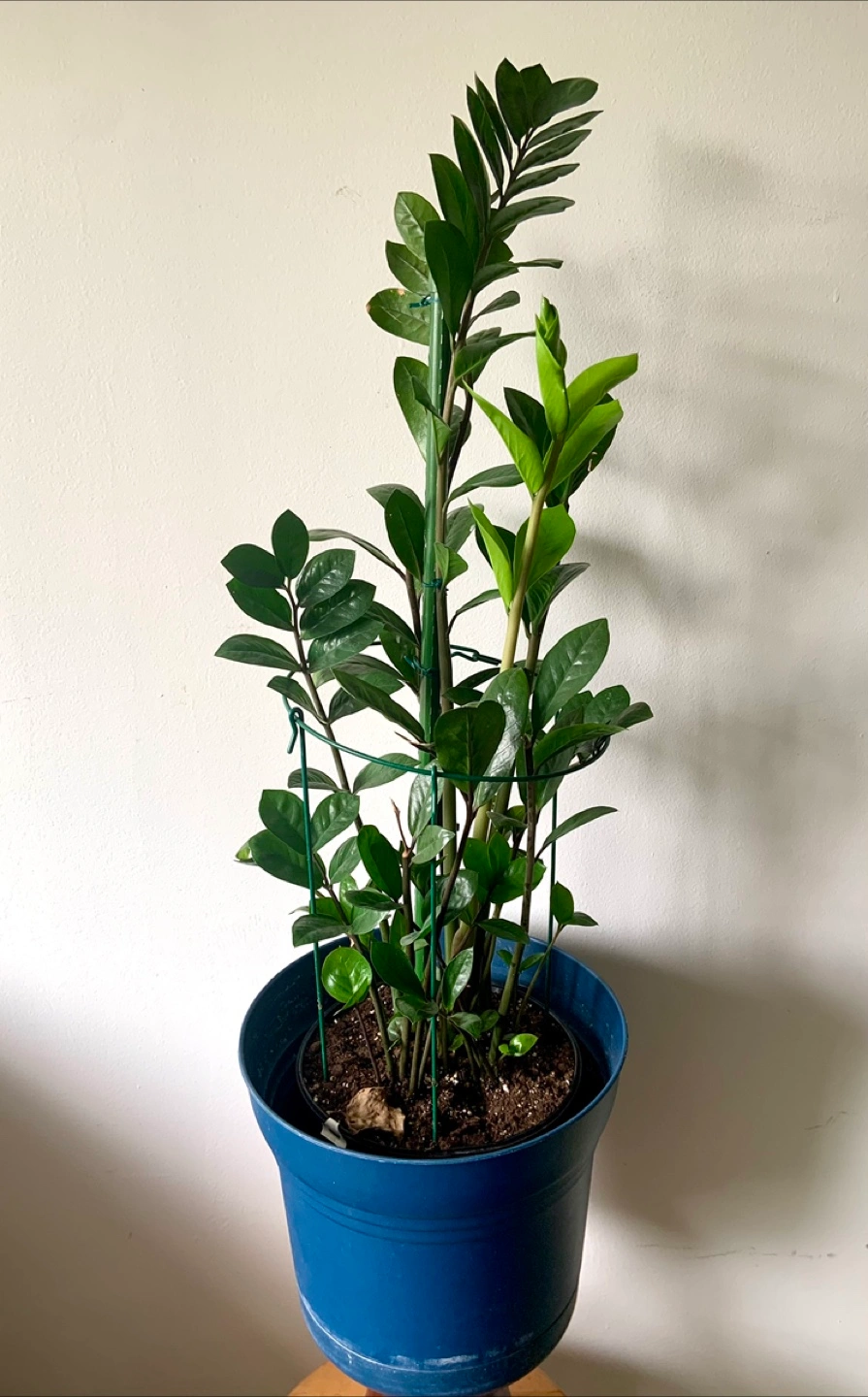 Healthy ZZ plant, potted in a blue container. Includes a plant support. Multiple stems. Great addition to any home.