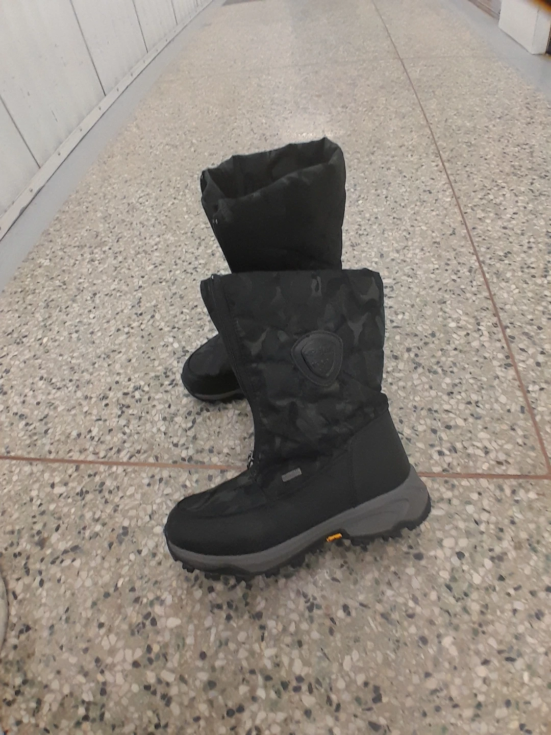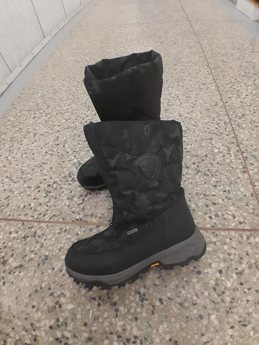 These black winter boots feature a cool camouflage pattern. They're designed for warmth and traction in snowy conditions. Water-resistant exterior original Pajar Women's size 8