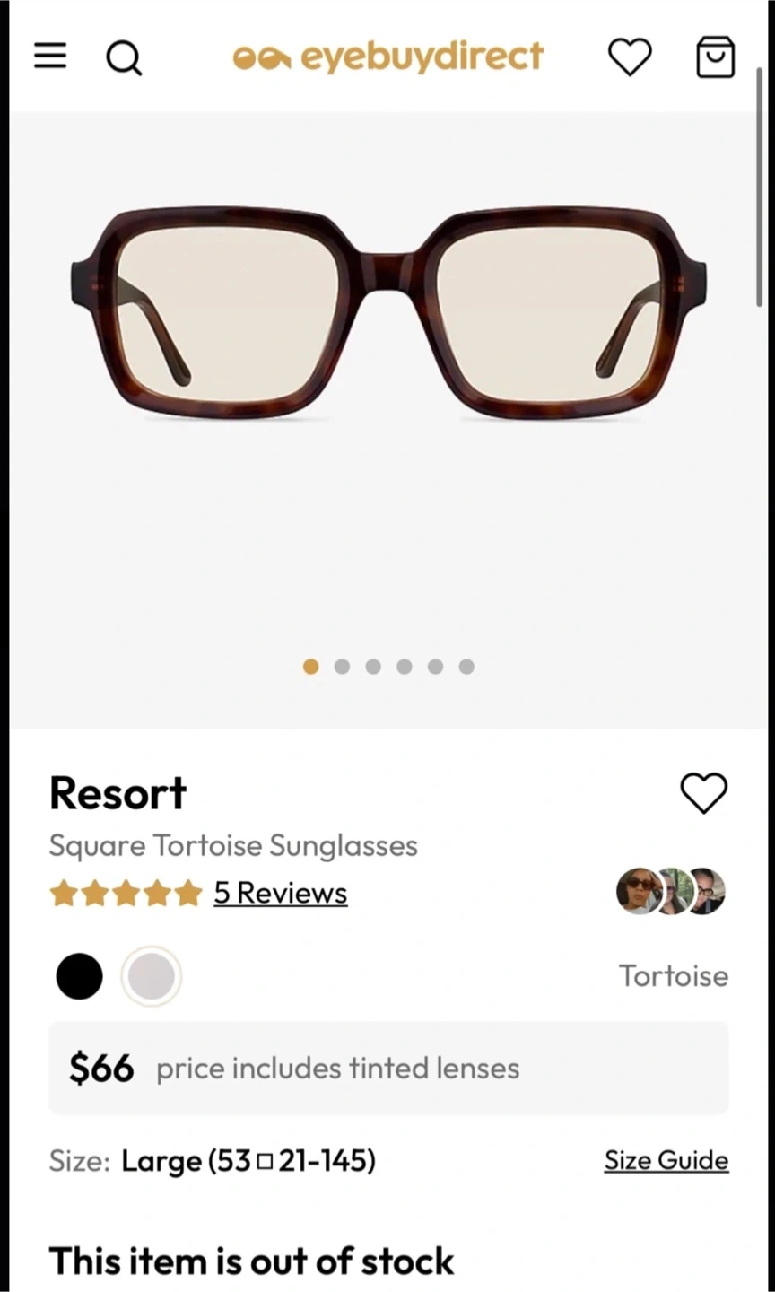 These are Eyebuydirect Resort Square Sunglasses in Tortoise. They are size Large (53 x 21-145). Includes a yellow microfiber pouch. This item is out of stock on the website.