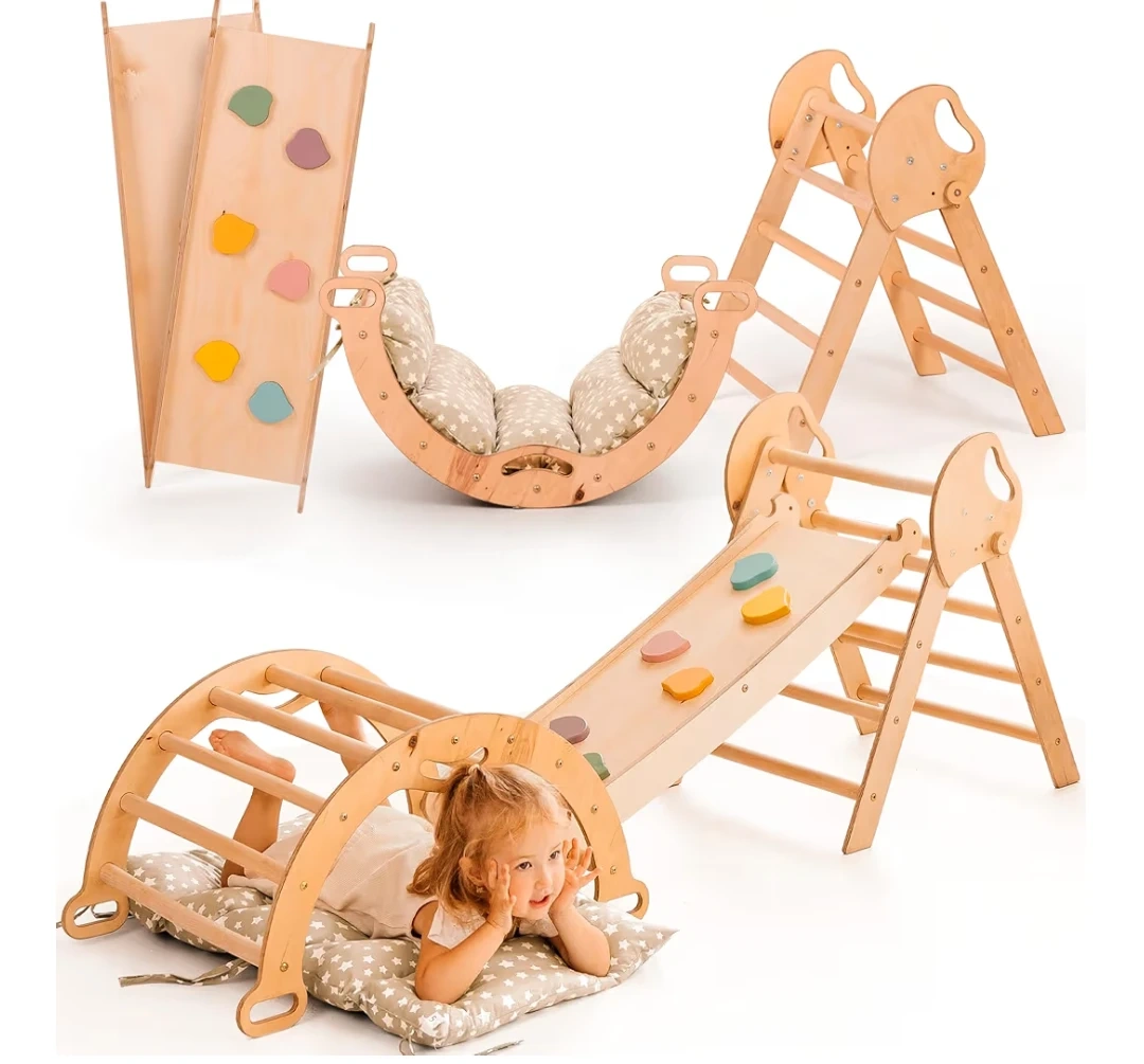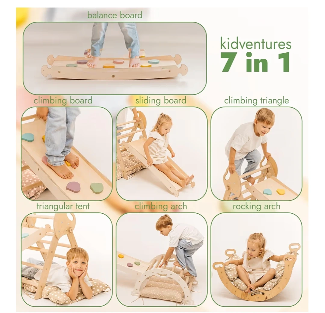 This Kidventures set includes a climbing triangle, a rocking arch with pillow, and a sliding/climbing board. It's made from wood and is suitable for active play. This set offers multiple ways for kids to climb, slide, and rock!