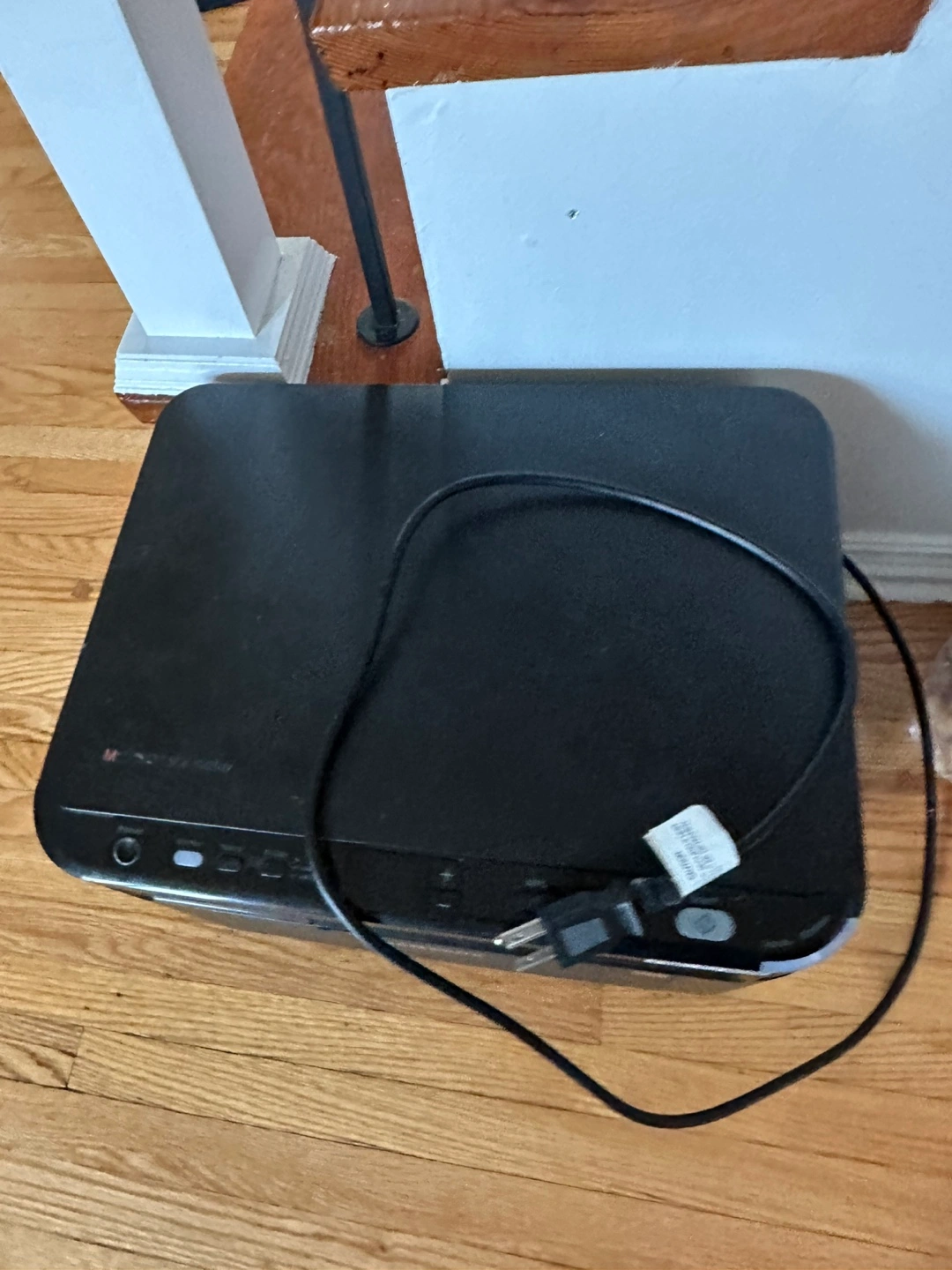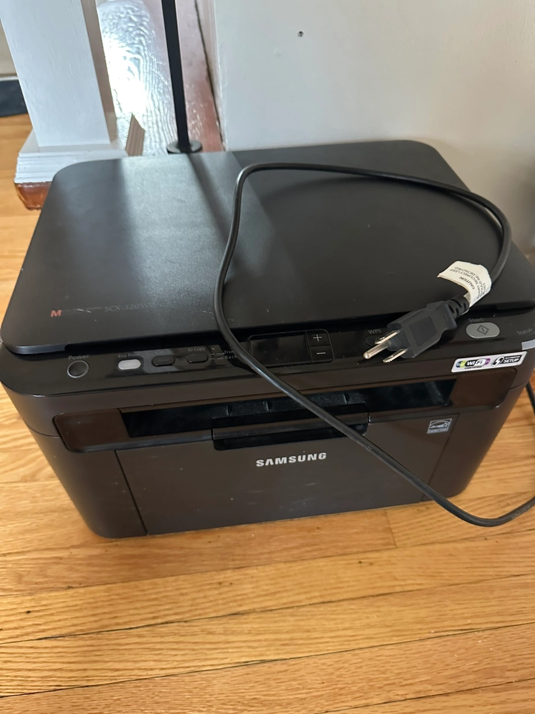 Wireless black and white printer, scanner, and copier. Includes power cord. Used condition.