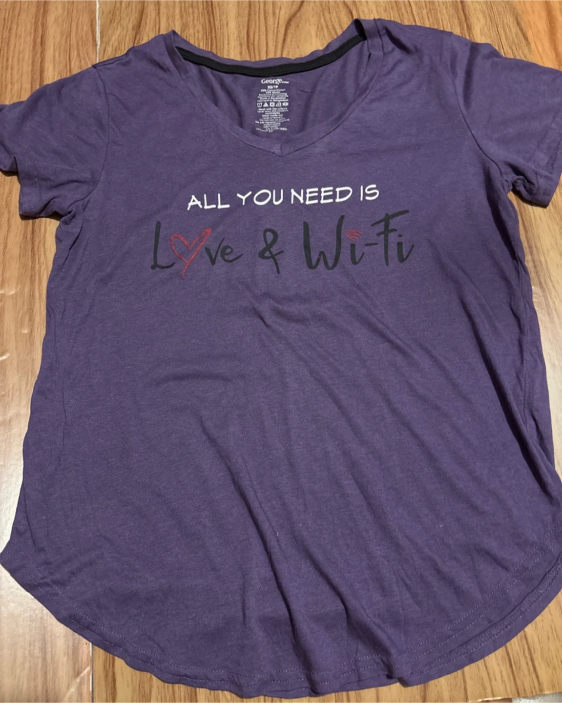 This is a gently used George purple t-shirt, perfect for casual wear. It features a v-neck and a fun print that says, "All you need is love & wifi". The shirt is in good condition and ready for a new home!
