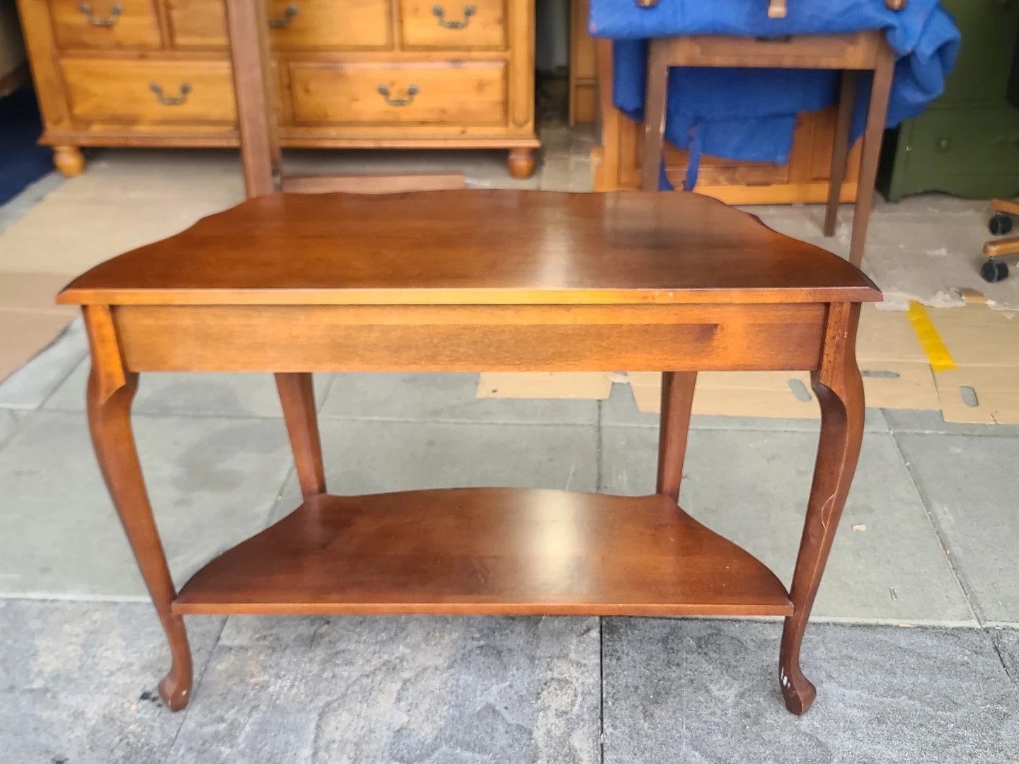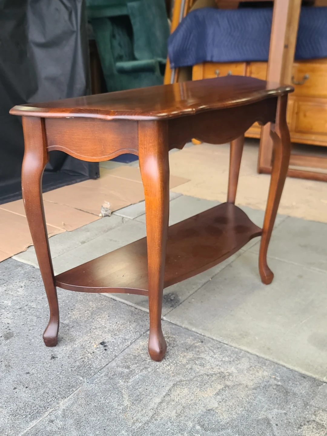 A classic wooden console table featuring elegant curved legs and a lower shelf for extra storage. It's crafted from solid wood with a warm, rich finish. Perfect for an entryway or living room. Measurements to follow. Delivery can be arranged. Viewing and pickup by appointment.